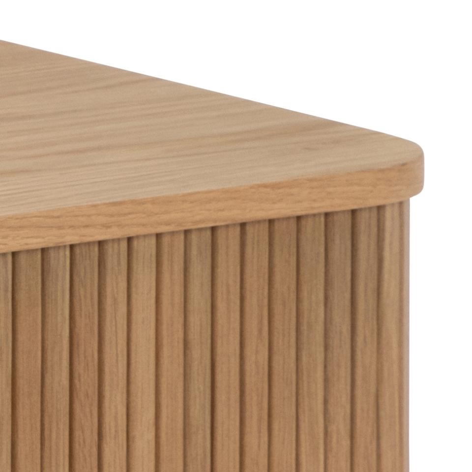 Stolik o prostokątnym kształcie z zaokrąglonymi narożnikami, łączy w sobie nowoczesną i rustykalną estetykę, uzupełniając najmodniejsze style wnętrz. Stolik ozdobiony dekorami z listew, ozdobiony zaokrąglonym kształtem baltu i z akcenta z lakierowanego dębu. Dodatkowo, stolik jest wyposażony w przesuwane drzwiczki i otwartą przegrodę, zapewniając wygodne miejsce do przechowywania. Stoli wymaga montażu. Materiał: Płyta MDF z forniremdębowym. Podstawa drewno dębu. Wymiary kartonu: 137,5×77,5x10cm. Waga: 30 kg