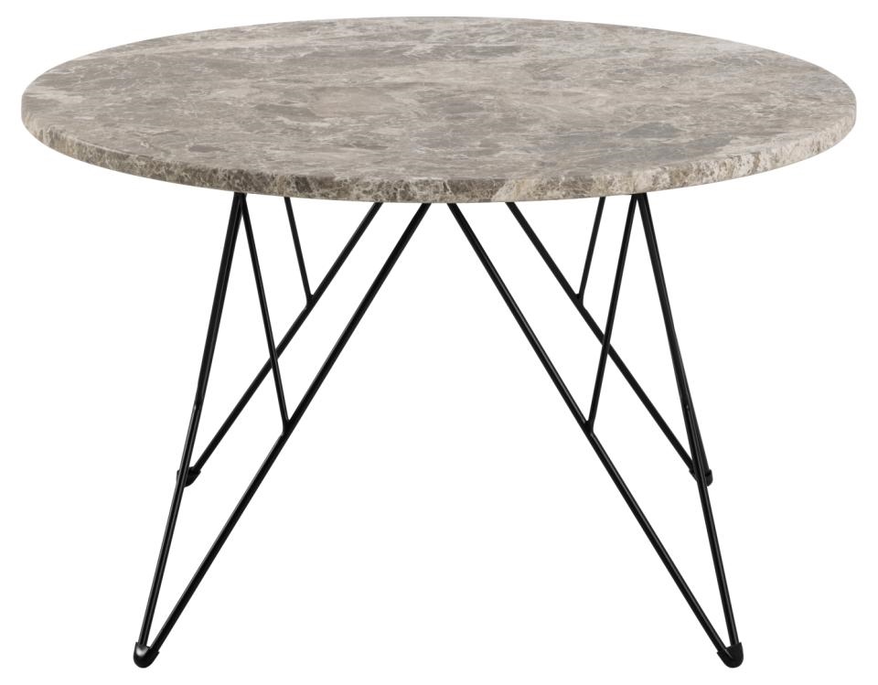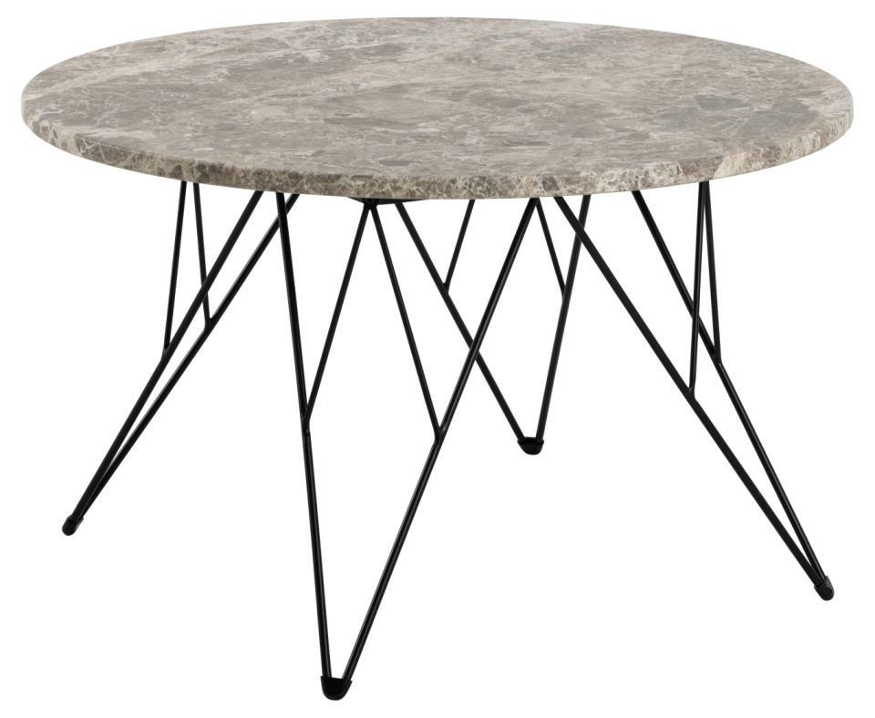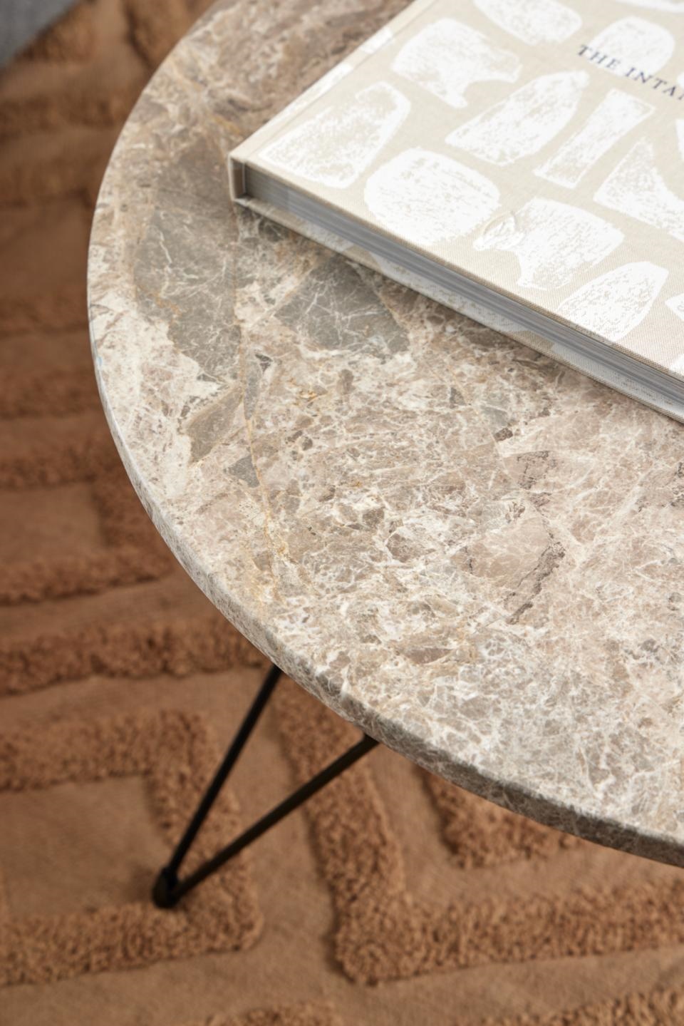 Okrągły stolik kawowy Prunus, blat z matowego szaro-brązowego marmuru lakierowanego Spider, druciana podstawa z matowej czarnej, szorstkiej stali malowanej proszkowo. Ten stolik kawowy spodoba się zarówno minimalistom, jak i maksymalistom. Posiada efektowny wizualnie blat wykonany z szaro-brązowego marmuru, wsparty na czarnej drucianej podstawie. Wyważony kontrast między proporcjami nadaje projektowi lekkiego uroku. Z łatwością dopasuje się do każdego stylu wnętrza. Waga stolika 30 kg. Wymiary kartonów: 14x87x100cm i 66x43x14,8cm