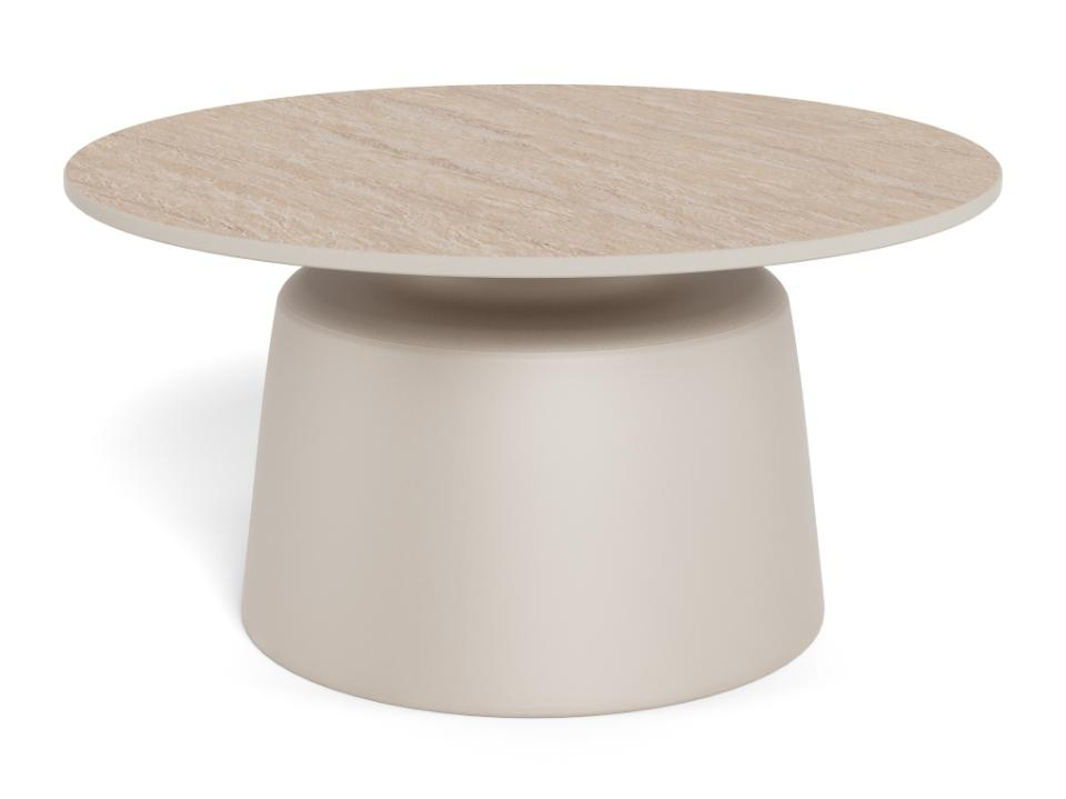Okrągły stolik kawowy Santorini, blat z beżowego trawertynu ceramicznego, podstawa z filarem z szarej, szorstkiej stali malowanej proszkowo.