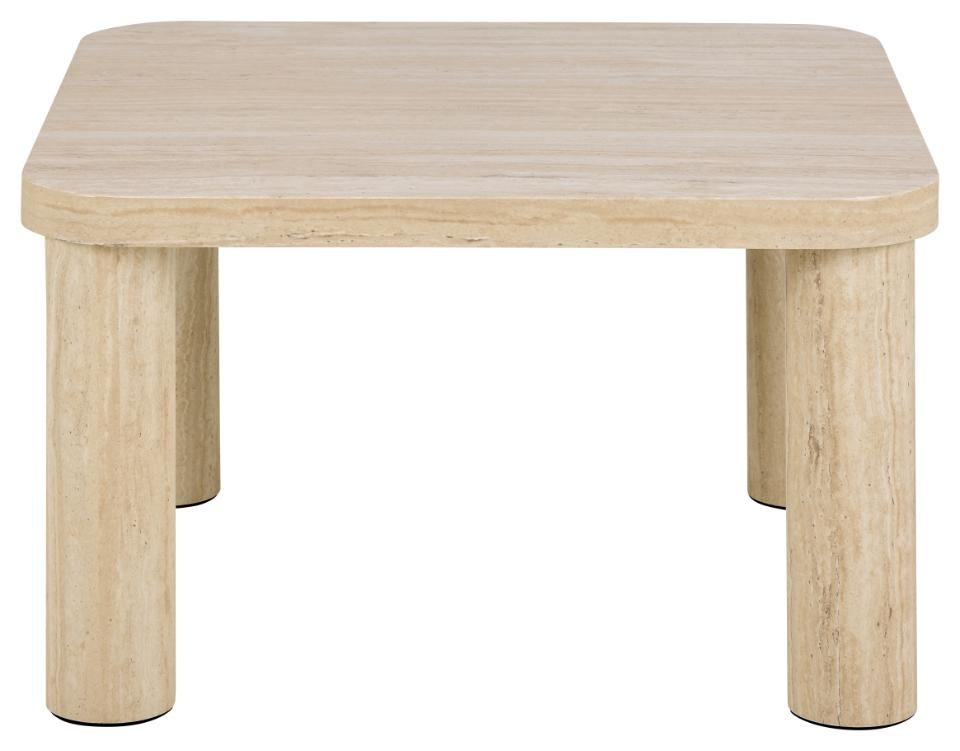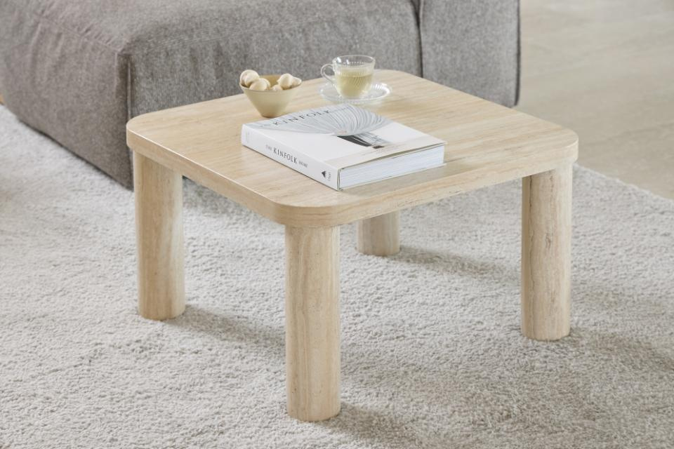 Ten stolik kawowy, o eleganckim, trawertynowym wykończeniu, doskonale wpisuje się w przestrzeń, nadając jej wyjątkowego charakteru. Połączenie masywnych, solidnych nóg i kwadratowego blatu z zaokrąglonymi narożnikami sprawia, że ??stolik staje się prawdziwą perełką. To atrakcyjny design, który pasuje do wielu stylów sof.