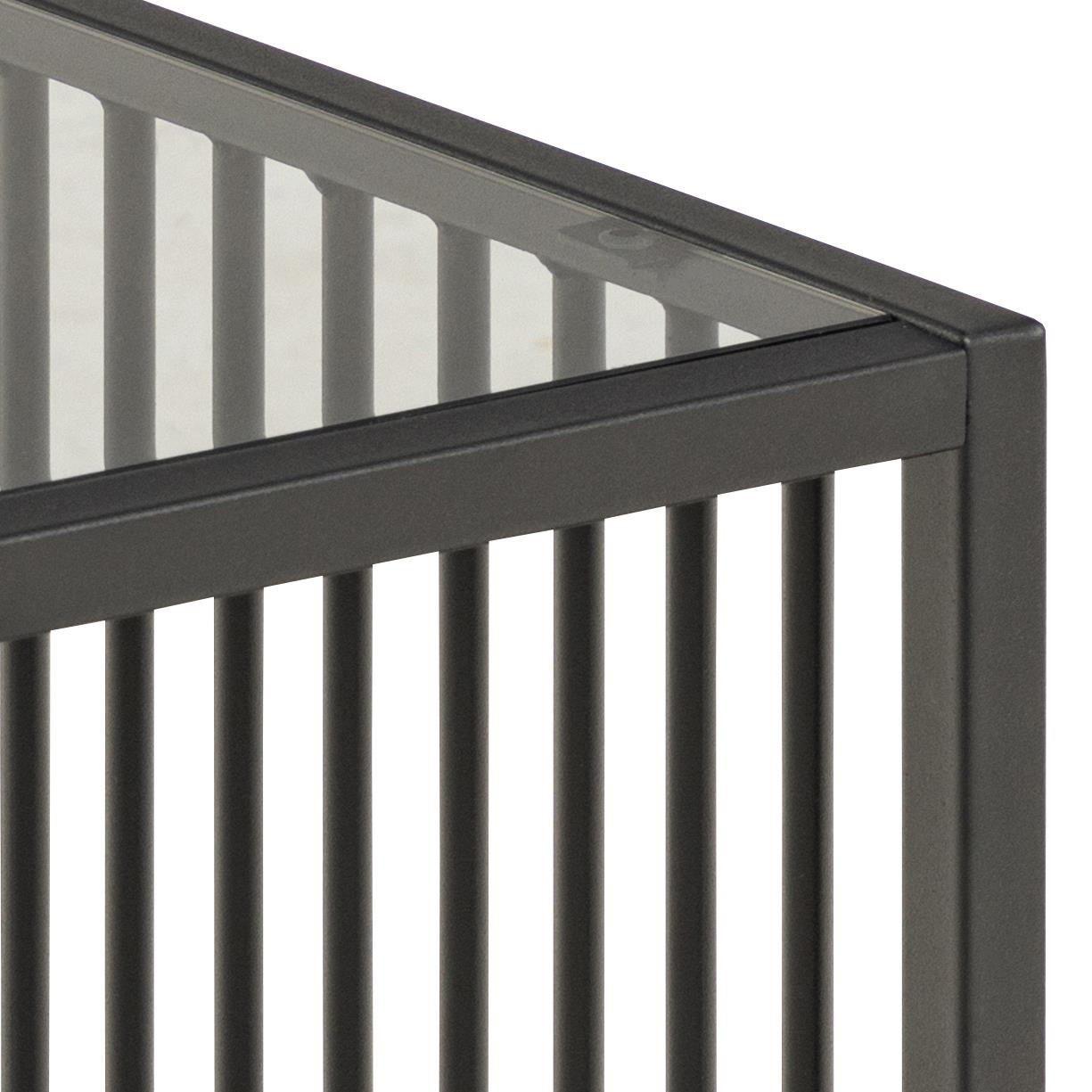 Stolik kawowy Strington to nowoczesny, industrialny model wykonany z użyciem malowanego proszkowo metalu oraz dymionego szkła. Stolik wyróżnia jego nietypowa podstawa – jej boki złożone są z cienkich, pionowych listewek wykonanych z metalu. Stolik posiada także szklany lat w kształcie kwadratu. Stolik Strington charakteryzuje niezwykła forma i niepowtarzalny design. Jako stolik kawowy, Strington sprawdzi się nie tylko w salonie obok sofy, ale także w biurowej poczekalni czy kawiarni. Ilość kartonów: 1 Wymiary kartonów: 47×42,5×6,5cm Waga kartonów: 4,3kg