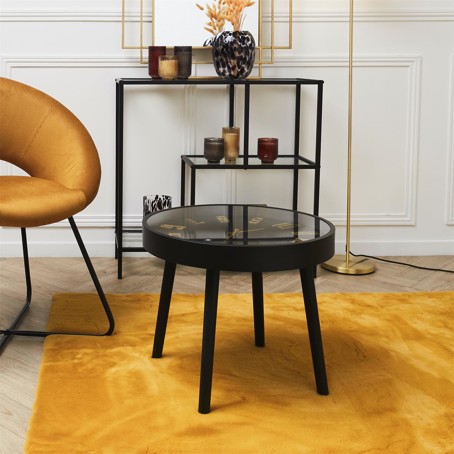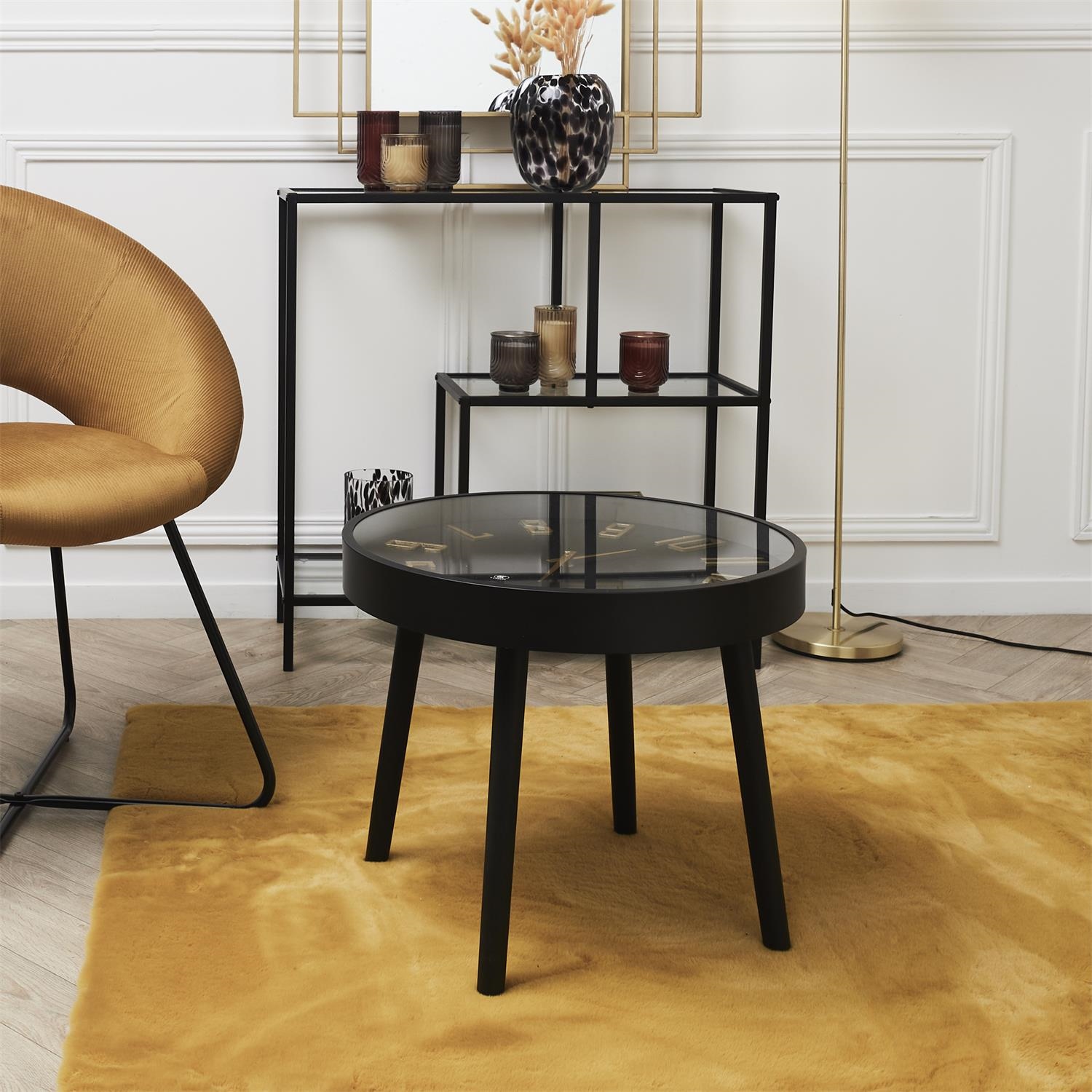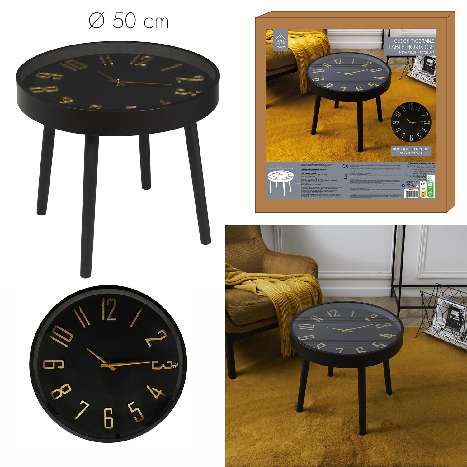 Okrągły stolik w którym blatem jest tarcza zegara to zarówno elegancki jak i nietypowy mebel. Czarny stolik wykonany został z drewnianych, sosnowych nóg, Metalowej ramy blatu, szklanego blatu pod którym jest tarcza zegara. Sama tarcza to połączenie płyty MDF oraz metalowych wskazówek. Na baterie (brak w zestawie): R6-AA Wymaga montażu (przykręcenia nóg do blatu) Wymiary kartonu: 52x52x12 cm, Waga: 5kg