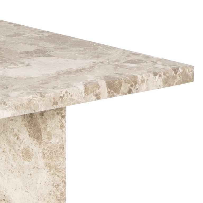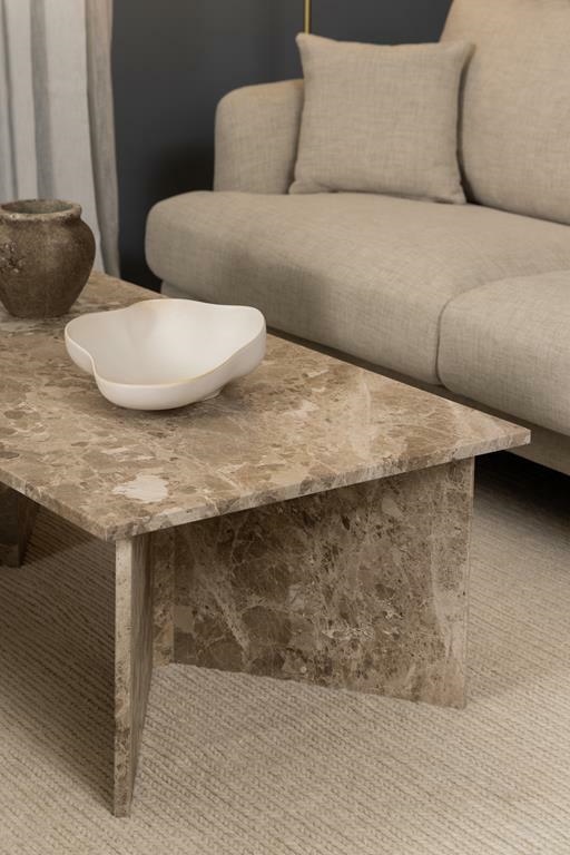 Ten stolik kawowy wprowadzi do salonu ponadczasowe wyrafinowanie. Prostokątny blat i podstawa w kształcie litery V nadają pomieszczeniu wyjątkowego charakteru. Wykonany z beżowego marmuru z jasnymi żyłkami, kamień naturalnie różni się kolorem, strukturą i powierzchnią, dzięki czemu każdy egzemplarz jest wyjątkowy. Jest to rodzaj wyrazistego elementu, który pozostaje aktualny bez względu na trendy. Główne cechy: Rzeźbiarski stolik kawowy wniesie wyrafinowanie do salonu. Kwadratowy blat i podstawa w kształcie litery V zapewniają nowoczesny wygląd. Wykonany z beżowego tureckiego marmuru z jasnymi żyłkami. Kamień naturalnie różni się kolorem, strukturą i powierzchnią, dzięki czemu każdy egzemplarz jest wyjątkowy. Matowe, lakierowane wykończenie podkreśla piękno materiału. Ilość kartonów: 2 Wymiary kartonów: 14x150x93cm 62x72x61cm Waga kartonów: 65kg 62kg
