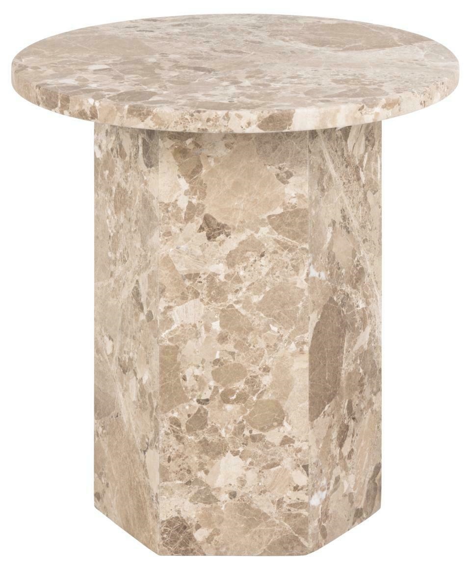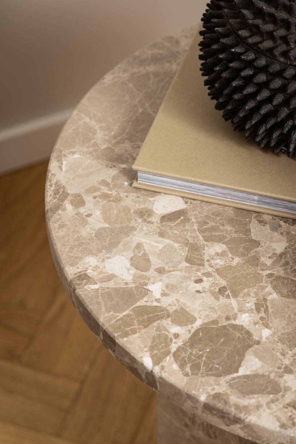 Okrągły stolik kawowy Naxos, blat i podstawa z matowego marmuru lakierowanego w kolorze latte brown. Czyste linie i geometryczna forma tego stolika kawowego dodają uroku i wyrafinowania do części wypoczynkowej. Każdy stolik jest wyjątkowy ze względu na naturalne różnice w kolorze, powierzchni i strukturze kamienia. Oprócz okrągłego blatu, sześciokątna podstawa filaru zapewnia solidną podstawę, jednocześnie podkreślając surowe piękno materiału.