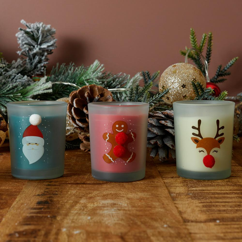 Świąteczna świeczka o świątecznym zapachu. Świeca zapachowa w półprzezroczystym szklanym świeczniku. Szkło świecy wygląda jak zaszronione, co dodaje jej świątecznego uroku.