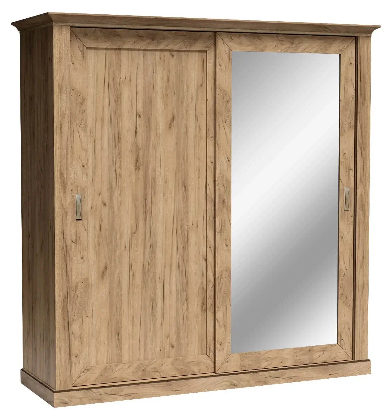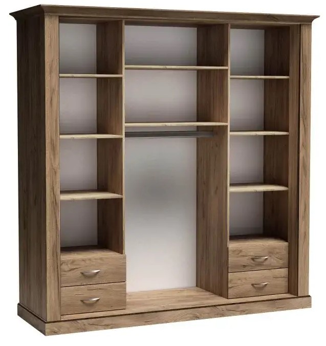 Szafa z kolekcji Antica mająca dwoje przesuwnych drzwi, w tym jedne z lustrem. Duża i bardzo pojemna, posiada cztery szuflady oraz osiem półek. Swoją sekcję otrzymał również drążek, który pozwala na zawieszenie ubrań, jak i na zagospodarowanie pozostałej przestrzeni szafy. Mebel pasuje do sypialni, przedpokoju czy salonu. Można tworzyć z nim wiele aranżacji. Szafa ta przypadnie do gustu zwolennikom klasycznego wyglądu oraz nienachalnej elegancji. Dostępna w kolorze kraft złoty.