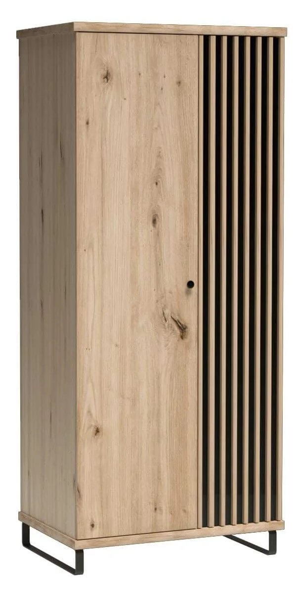 Duża, pojemna szafa z półkami i drążkiem do wieszania ubrań. Idealna do salonusypialni. Ozdobne listwy w postaci lameli dodają szafie ciekawego charakteru, drobny mały uchwyt to wart uwagi detal, który idealnie wtapia się w kolor wybarwienia szafy jakim jest ARTISAN. Szafę można postawić na metalowych, solidnych nogach o wysokości 10cm.