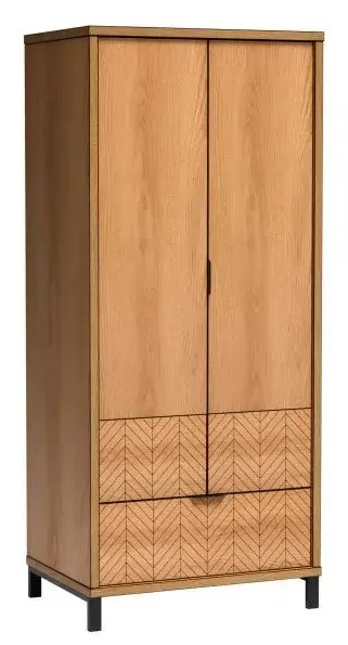 Prosta, funkcjonalna szafa dwudrzwiowa w kolorze dąb karmel z kolekcji FONTI. W dolnej części znajdziemy dużą, pojemną szufladę na bielizne czy drobiazgi. Po prawej stronie znajdują się półki, które pozwalają na wygodne ułożenie ubrań. Po lewej stronie w górnej części znajdziemy półkę a pod nią drążek do wieszania ubrań.