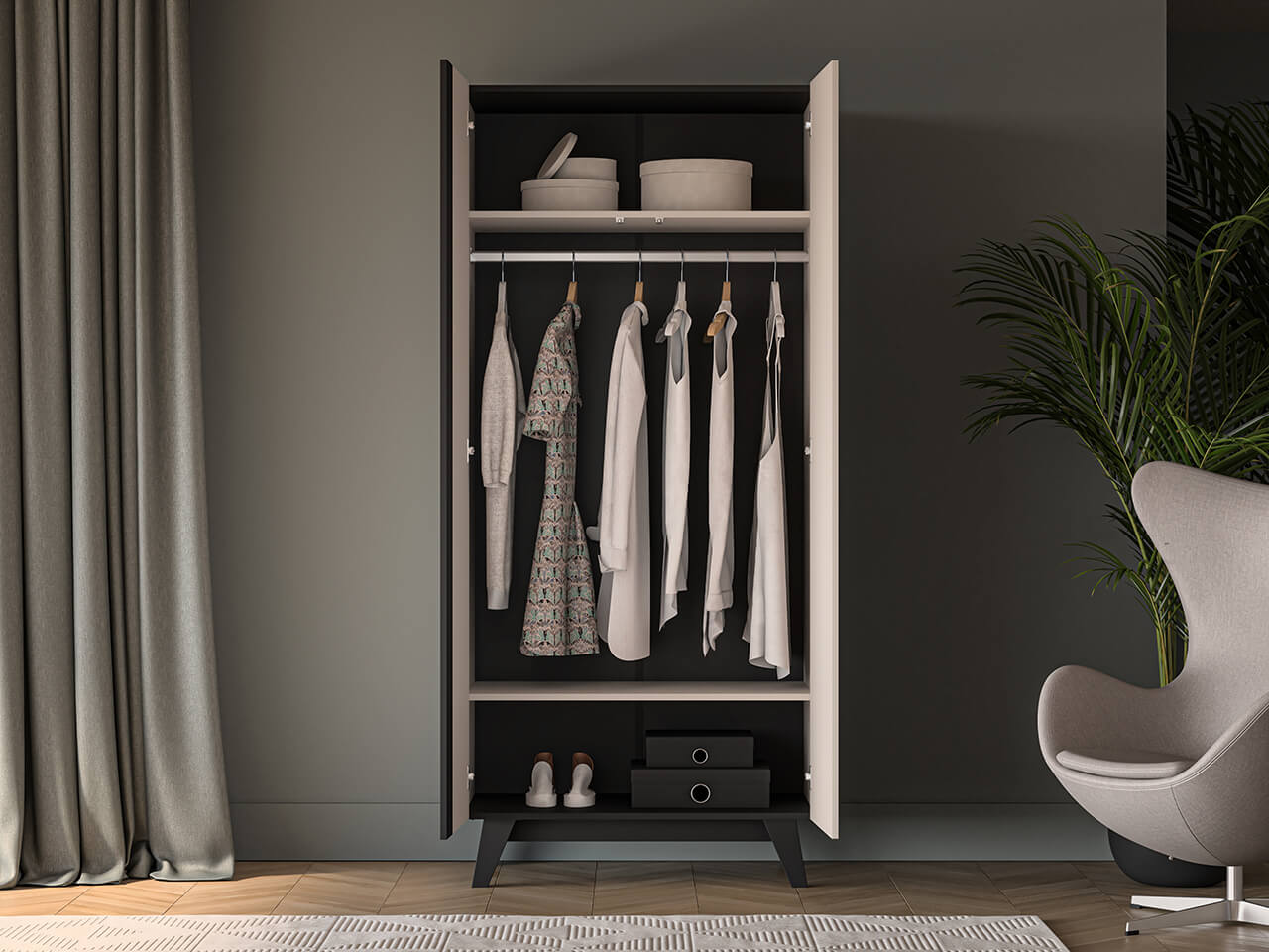Dwudrzwiowa szafa Freshion 01 to mebel, w którym przechowasz swoją odzież, dodatki oraz inne domowe tekstylia. Dzięki solidnemu drążkowi umieszczonemu na całej szerokości bryły, ułatwi przechowywanie płaszczy, garniturów czy sukienek. Odpowiednia pojemność górnej i dolnej półki pozwoli schować na przykład pościel lub ręczniki. Dzięki szafie Freshion 01 zachowasz porządek we wnętrzu, a komfort codziennego użytkowania przeniesiesz na wyższy poziom.