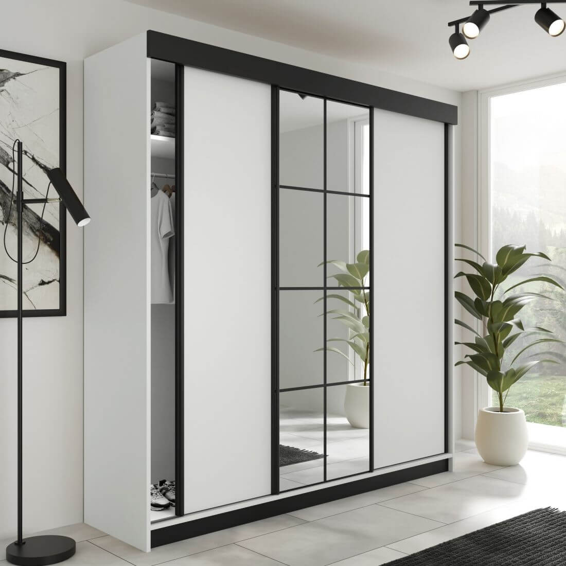 Ponadczasowa szafa z kolekcji LAMARO. Szafa zapewni miejsce do przechowywania, ale stanie się także atrakcyjną ozdobą sypialni, salonu czy przedpokoju. Proponujemy szeroki wybór kolorystyczny, dzięki czemu szafa LAMARO dopasuje się do każdego rodzaju wnętrza. Lustra naklejone na czarny front szafy nadają niepowtarzalnego i eleganckiego wyglądu.