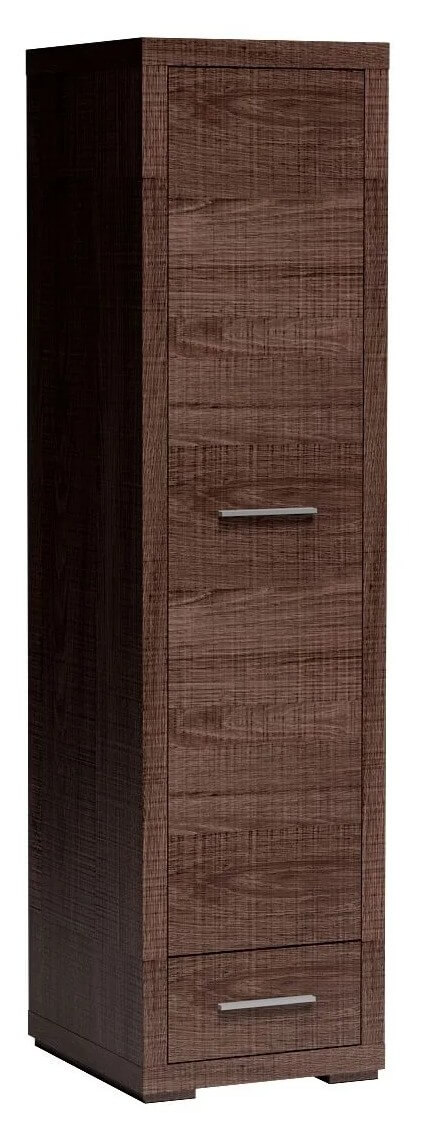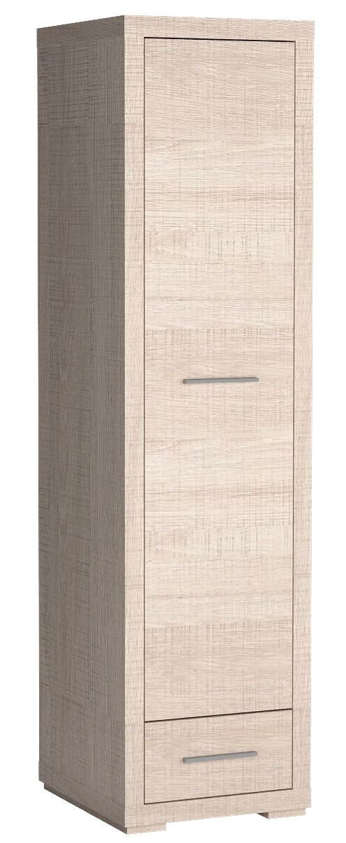 zafa jednodrzwiowa z kolekcji Vegas. Posiada w środku drążek, który pozwala na zapełnienie wolnej przestrzeni szafy. Poniżej znajduje się mała szuflada na drobniejsze akcesoria. Szafa będzie pasować do wielu aranżacji, wpasuje się w każdy kąt i wprowadzi miłej atmosfery do pomieszczenia. Metalowe uchwyty uwydatniają stanowczość mebla. Dostępna w dwóch wybarwieniach.