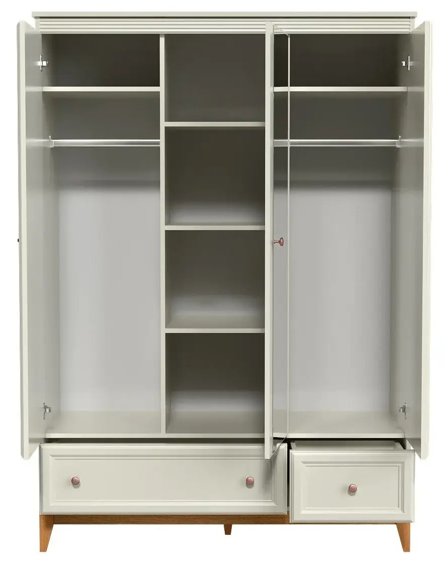 Centralna część szafy wyposażona jest w lustro, za którym kryją się trzy pojemne półki – idealne na ubrania złożone, dodatki czy pościel. Po bokach znajdują się przestrzenie z półką górną i drążkiem na ubrania wiszące, co zapewnia pełną organizację garderoby.