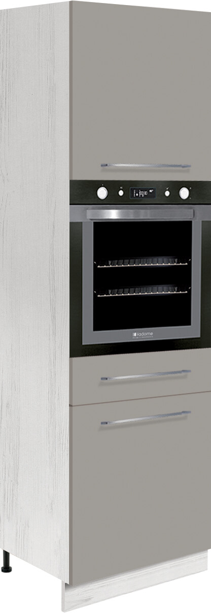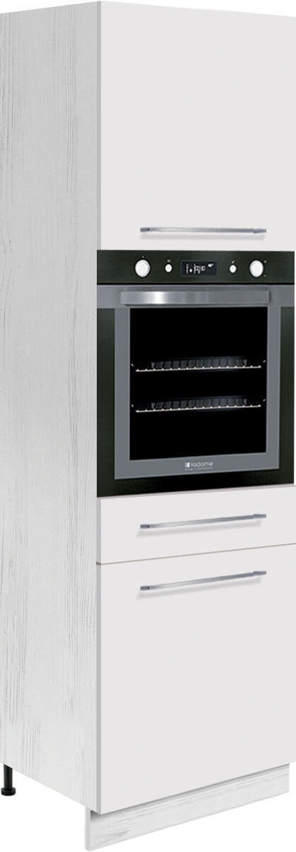 Szafka kuchenna wysoka na piekarnik do zabudowy. W środku za drzwiczkami górnymi i dolnymi znajduje się półka. Dodatkowo pod piekarnikiem umieszczono małą szufladę.