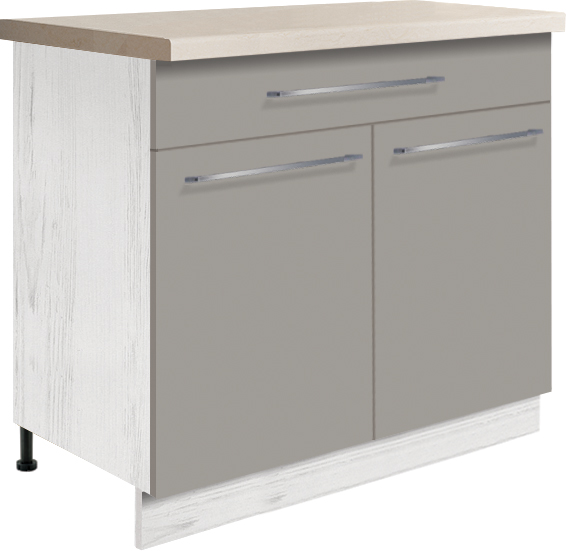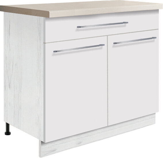 Szafka sprzedawana bez cokołu maskującego nóżki. Cokół dokupuje się osobno w odcinkach 100 cm, 160 cm lub 220 cm. Jest to rozwiązanie nie tylko praktyczne, ponieważ nie ma łączeń przy każdej szafce z osobna, ale również dające lepszy efekt wizualny.