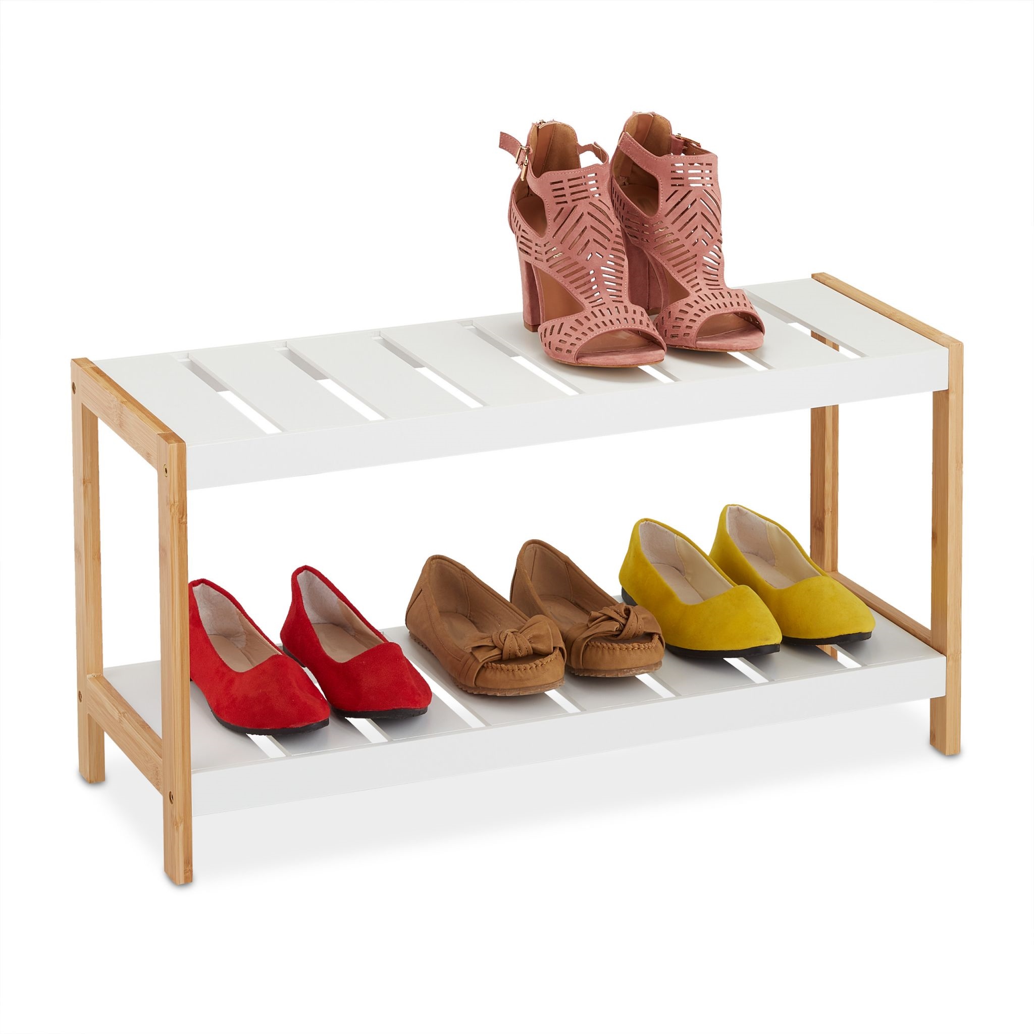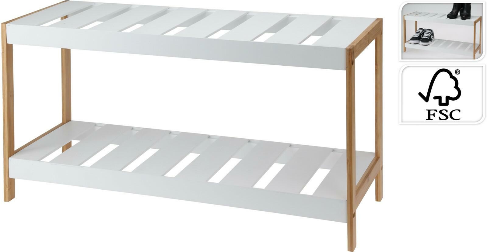 Regał na buty wykonany z wysokiej jakości bambusa i MDF z certyfikatem FSC 100%, co świadczy o zastosowaniu materiałów pochodzących z odpowiedzialnych źródeł. Jego wymiary to 70x26x36 cm, co czyni go idealnym rozwiązaniem do przechowywania butów w przedpokoju, sypialni lub innych pomieszczeniach. Regał charakteryzuje się eleganckim designem, łącząc białe półki z naturalnymi bambusowymi nogami, co dodaje mu świeżości i lekkości. Konstrukcja w stylu knock down ułatwia transport i montaż, co sprawia, że jest wygodny w użytkowaniu.To praktyczne i stylowe rozwiązanie, które pomoże w zachowaniu porządku w obuwiu, jednocześnie stanowiąc dekoracyjny element wnętrza.