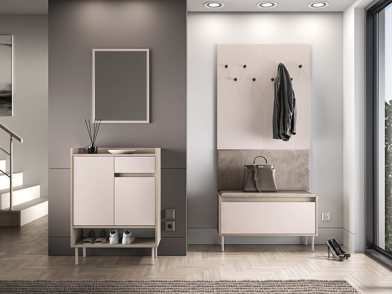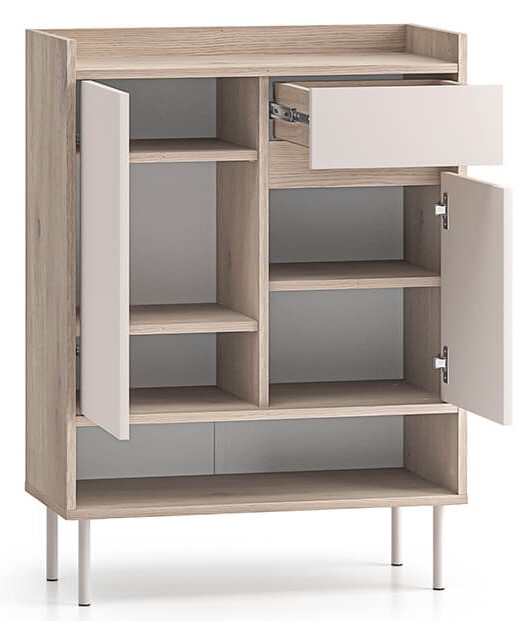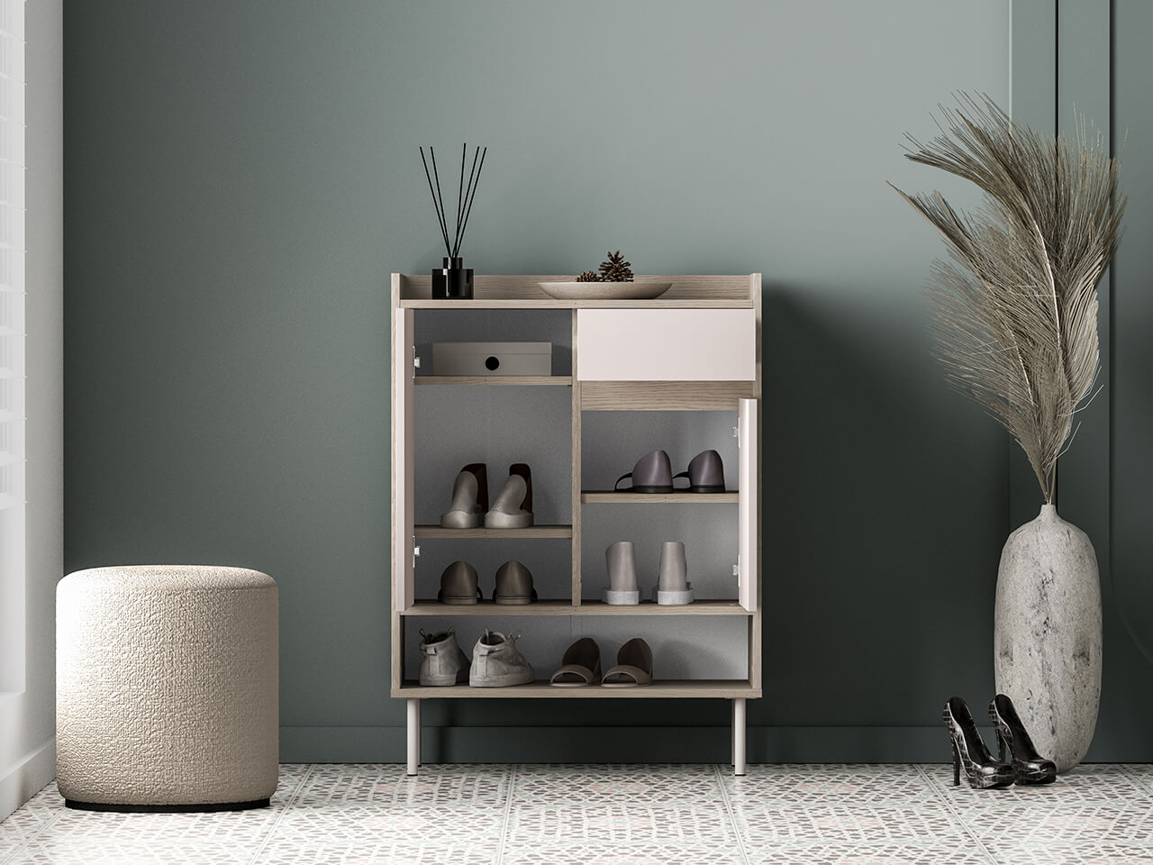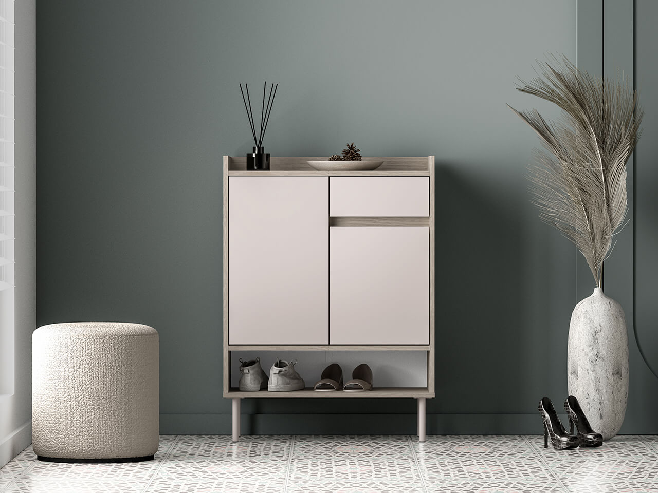 Szafka na buty Voco 03 jest optymalnym rozwiązaniem do każdego przedpokoju. Mebel tworzy pięć, zamykanych wnęk, w których przechowasz swoje buty. Szafka zamykana jest klasycznymi, podwójnymi drzwiczkami. Na górze bryły znajduje się mała szuflada, w której schowasz np. kluczyki do samochodu czy przybory do butów. Obniżony blat to zarówno designerskie jak i praktyczne rozwiązanie – klucze czy dokumenty nigdy nie spadną za komodę. Dolna część mebla to otwarta, szeroka półka, na którą łatwo odłożysz codzienne obuwie, zachowując porządek w swoim wnętrzu.