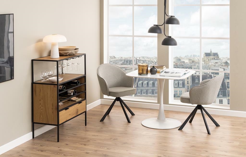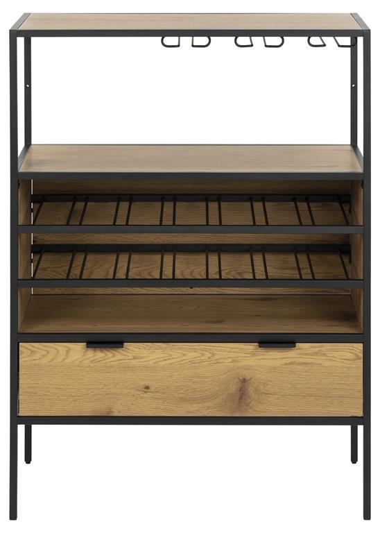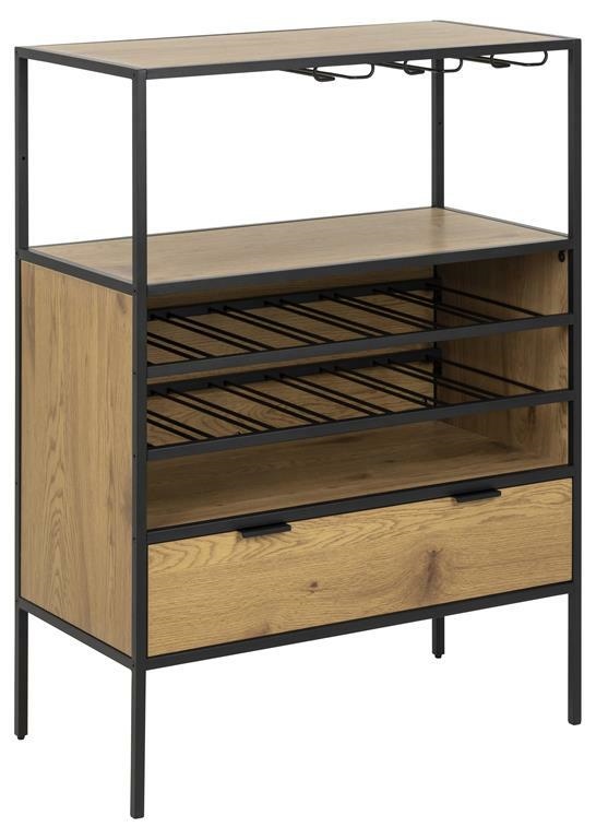 Szafka na wino Seaford to jeden z najnowszych elementów tej kolekcji. Dzięki możliwości praktycznego przechowywania zarówno kieliszków do wina, jak i butelek, będzie to doskonały wybór dla wszystkich miłośników wina. Umieść przekąski na blacie i schowaj przybory kuchenne w szufladzie – jest tam mnóstwo miejsca. Połączenie metalu i forniru w kolorze dzikiego dębu nadaje mu niesamowity, industrialny charakter, który podkreśli wystrój każdego nowoczesnego domu. Główne cechy : Nowoczesna szafka pokryta fornirem w kolorze dzikiego dębu Rama z czarnego, metalu malowanego proszkowo Stojak na butelki i uchwyt na szklanki Półki i szuflada do przechowywania Duński design chroniony wyłącznie dla Actona Ilość kartonów: 1 Wymiary kartonów: 113x46x14,5cm Waga kartonów: 24kg
