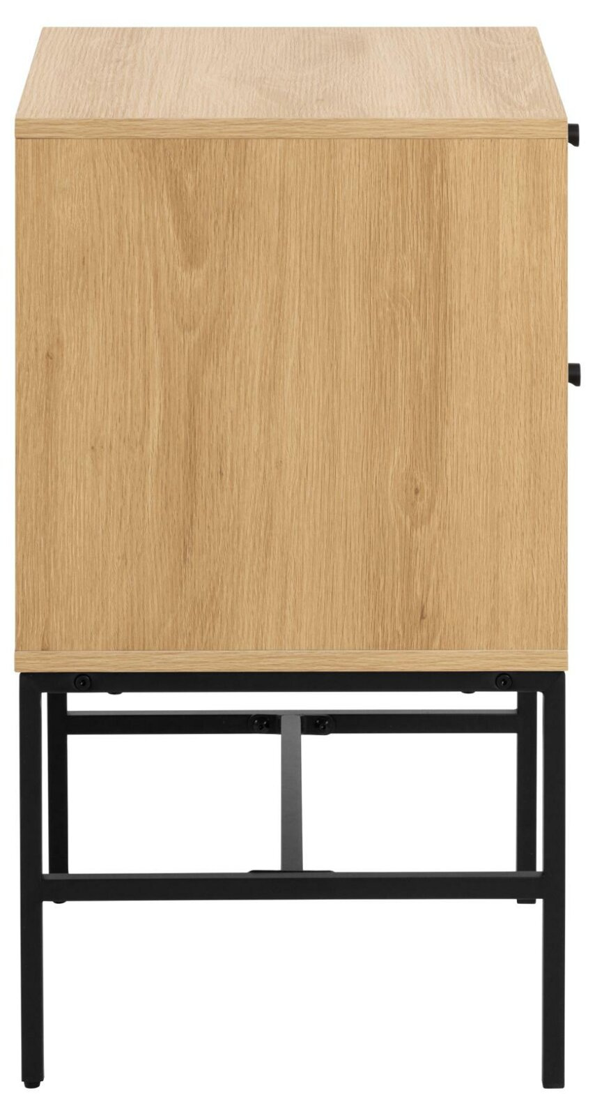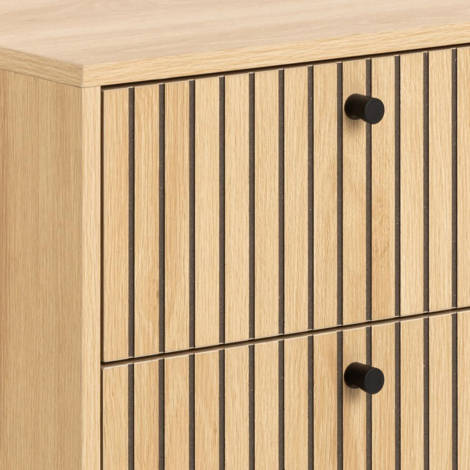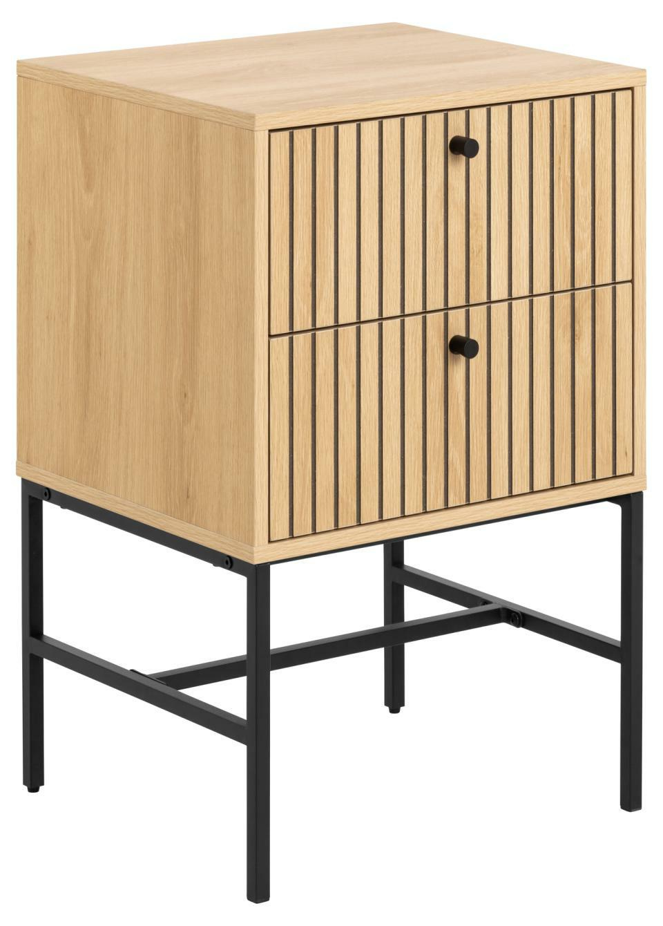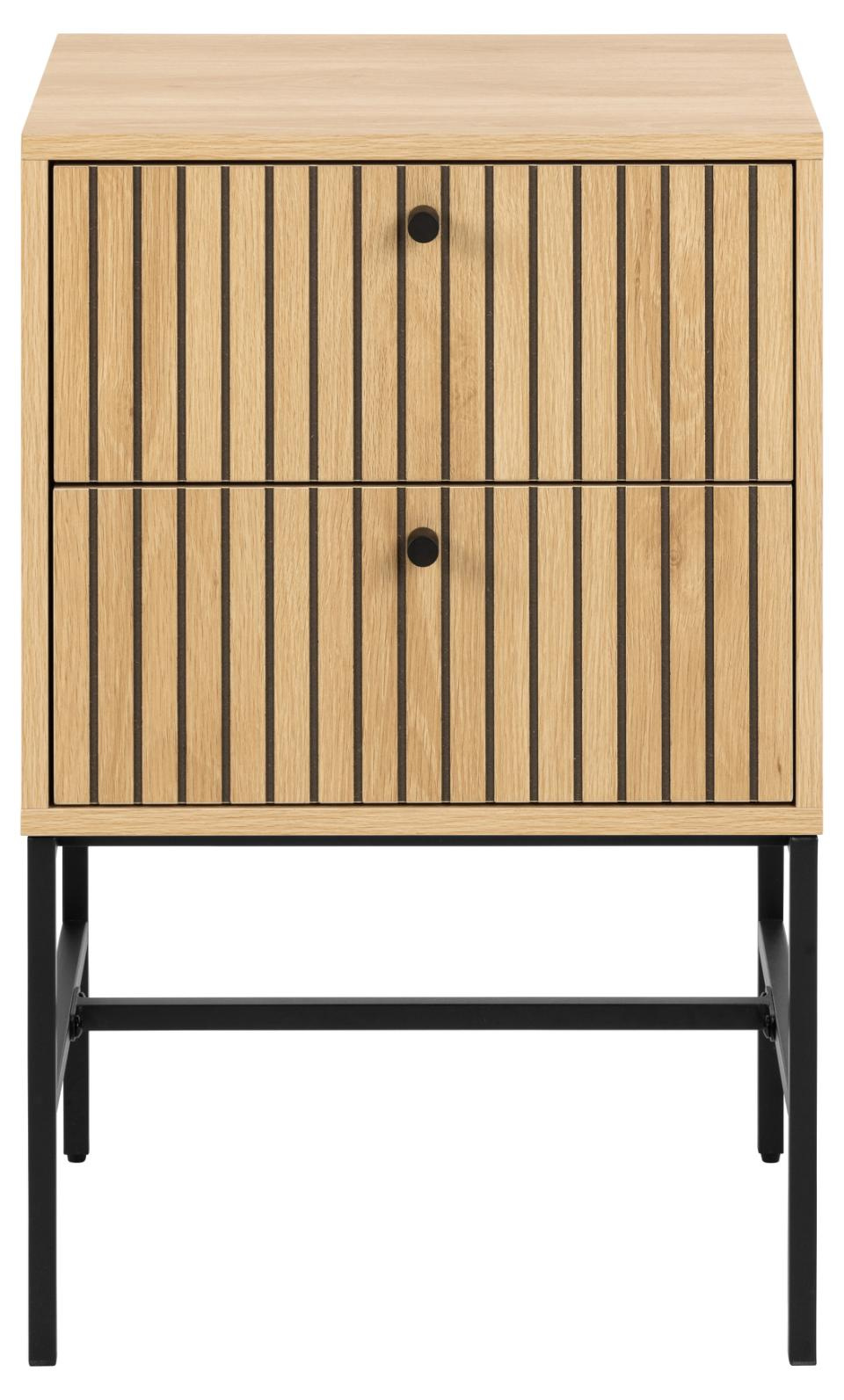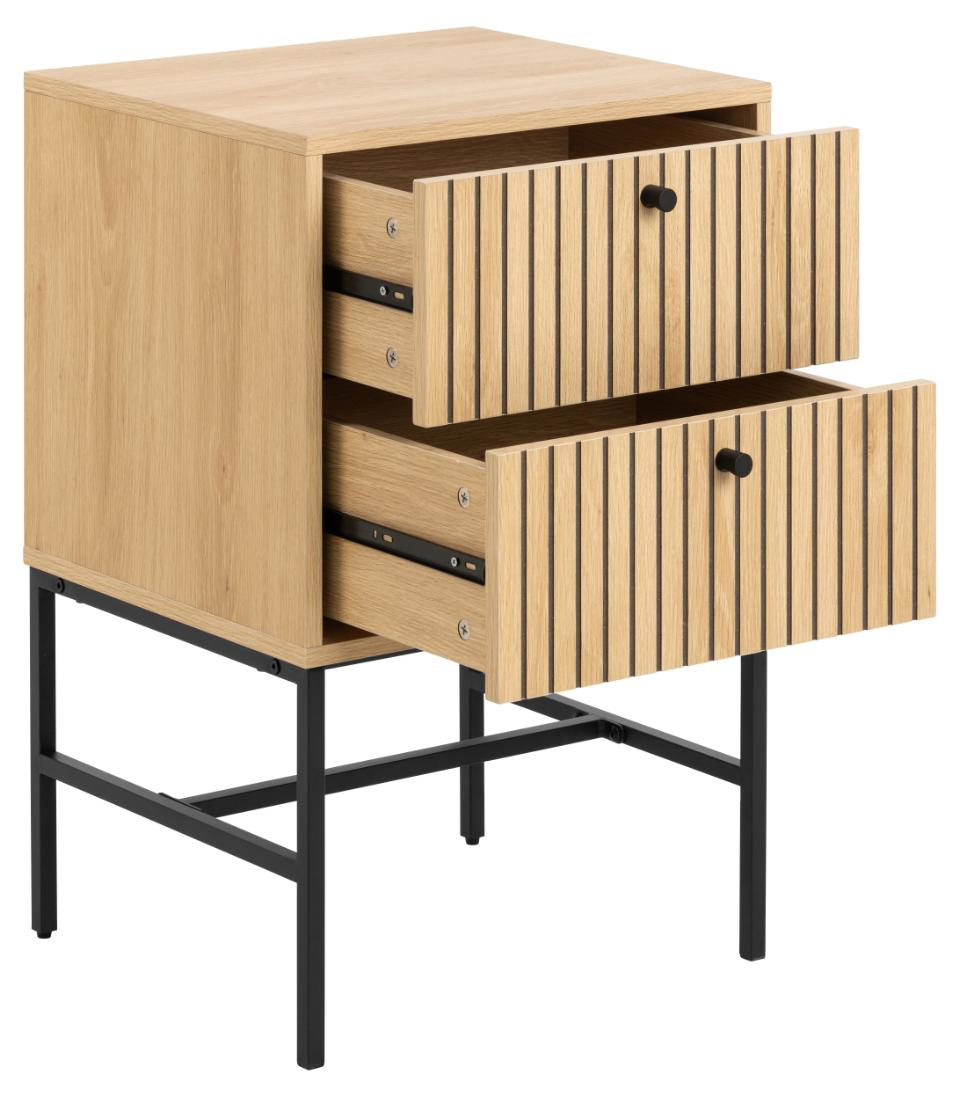 Prostokątna szafka nocna Albany, blat i 2 szuflady z dębowej, matowej okleiny, podstawa z matowej czarnej stali malowanej proszkowo, z frontem z lameli. Stolik nocny o prostokątnym kształcie, geometrycznej podstawie i lamelowym froncie wie, jak przyciągnąć uwagę. Kontrastowy, dębowy wygląd uzupełniony czarnymi akcentami tworzy dobrze wyważony efekt wizualny. Dzięki 2 szufladom stolik oferuje dużo miejsca do przechowywania niezbędnych rzeczy, a łatwa w pielęgnacji powierzchnia zwiększa jego praktyczność.