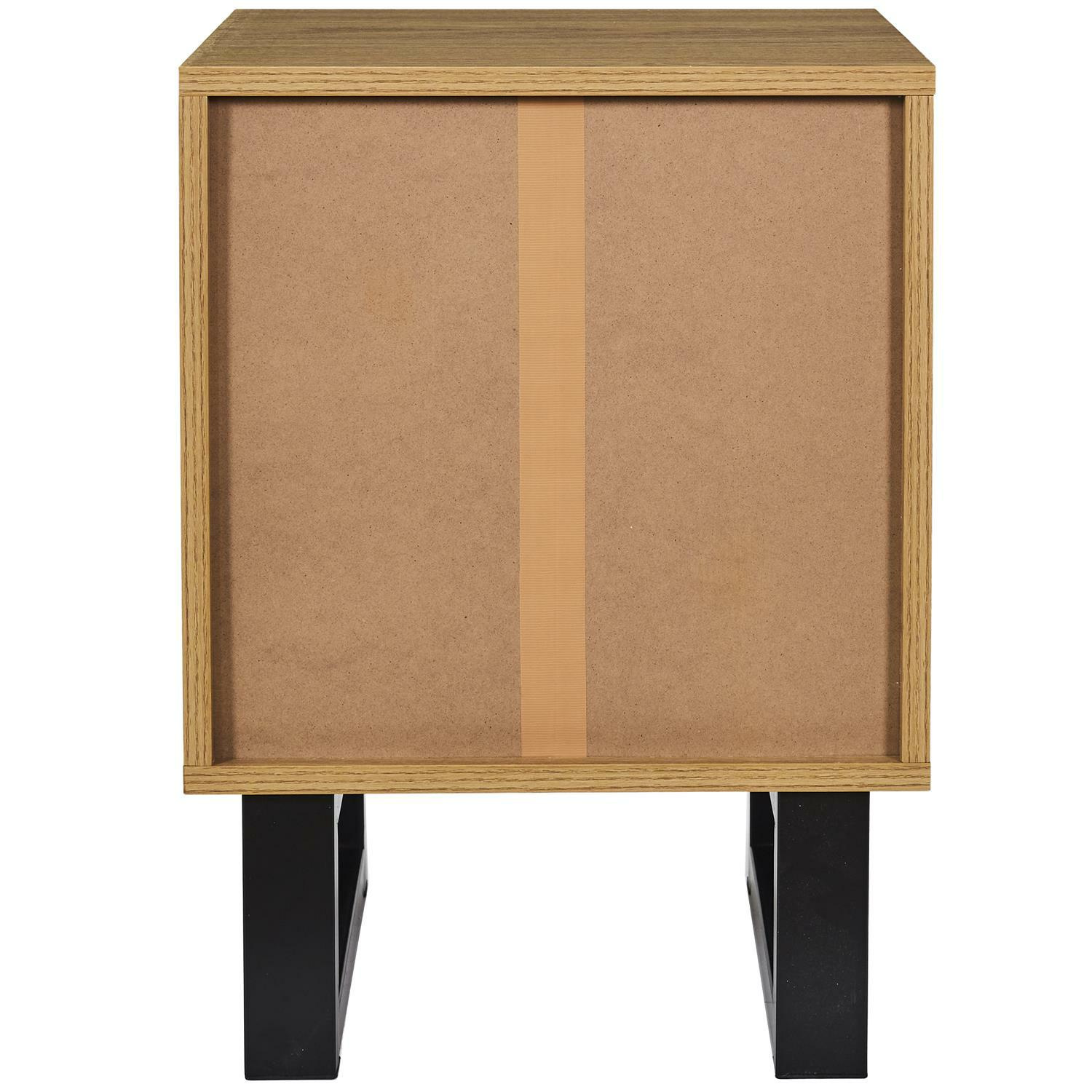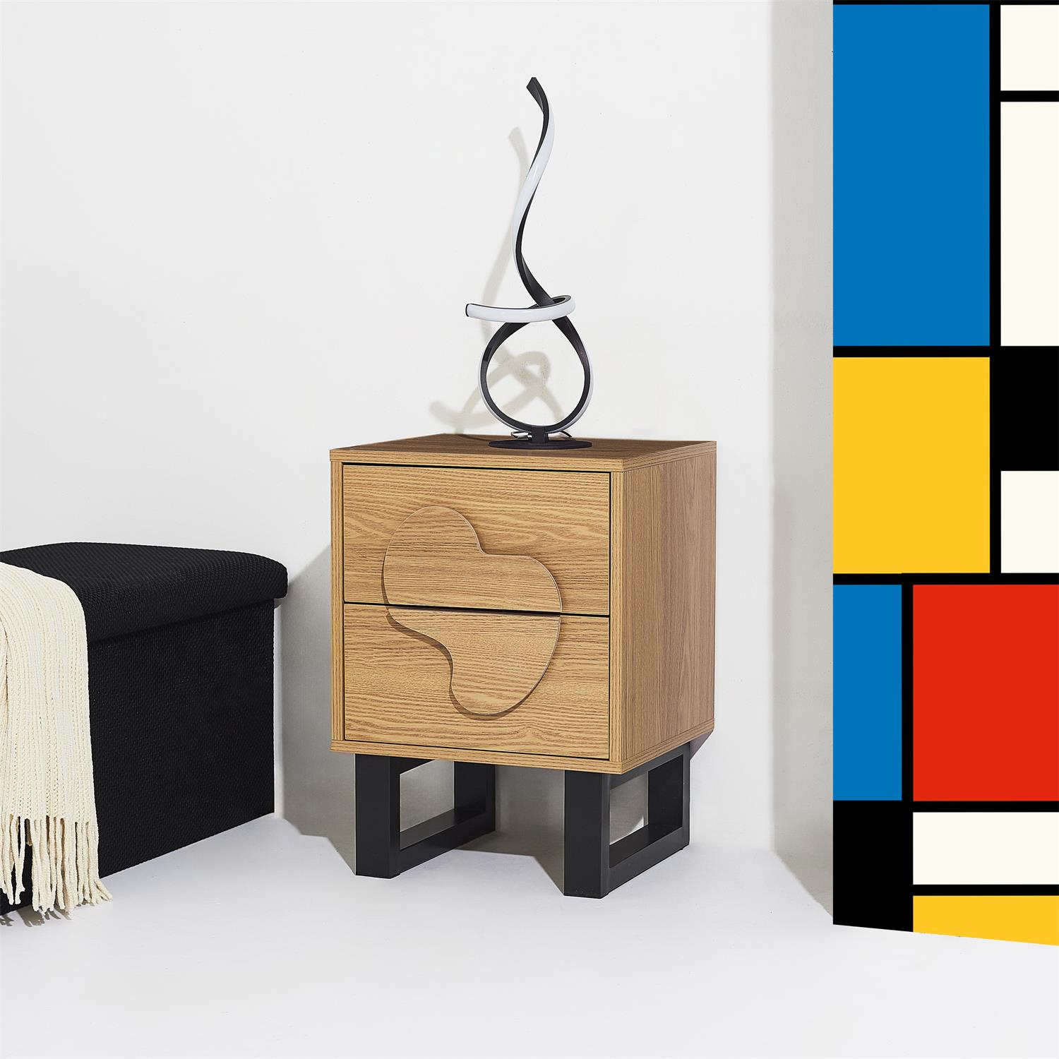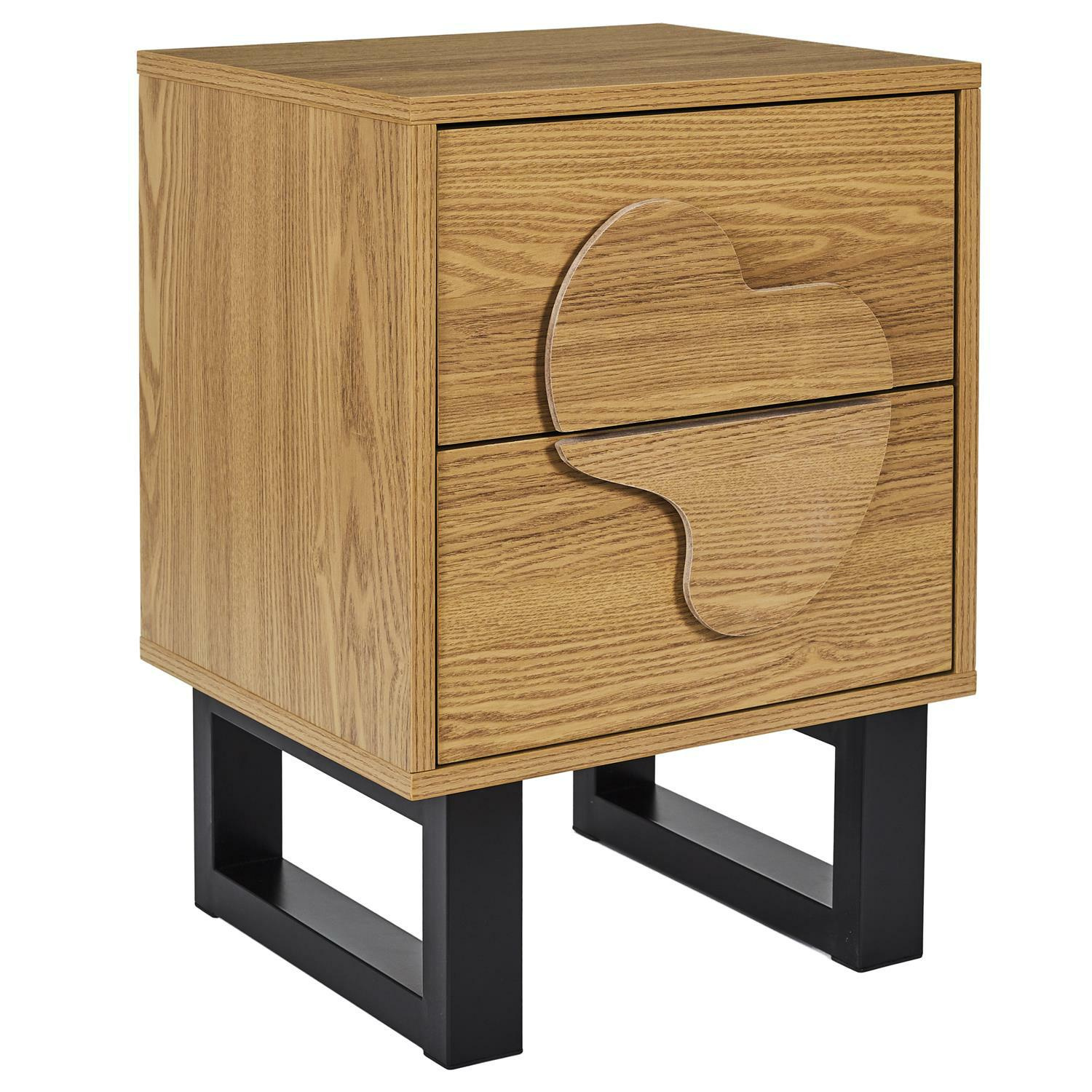 Szafka nocna Calypso yo połączenie designy i jakości. Szafka nocna z 2 szufladami wykonana została płyty MDF w okleinie imitującej dąb. Szuflady szafki wysuwają się lekko dzięki kulkowym szynom. Uchwyty szuflad to wypukły nieregularny kształt, który nawiązuje do stylu japandi. Podstawą szafki są nogi w kształcie płozy. Nogi wykonane zostały z metalu malowanego proszkowo. Szafka wymaga montażu. Max. obciążenie na 1 szufladę 5kg. Max. obciążenie na szafkę 30kg.