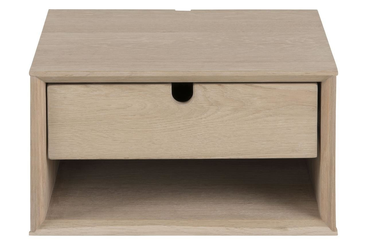 Szafka nocna Century wykonana została z płyty MDF fornirowanej dębem. Dodatkowo została zabezpieczona olejem z białym pigmentem, który wydobywa naturalne piękno drewna. Szafka może zarówno stać kolo łóżka ale również można zawiesić ją na ścianie. Posiada szufladę, która pomoże utrzymać porządek oraz przechowa niezbędne rzeczy.