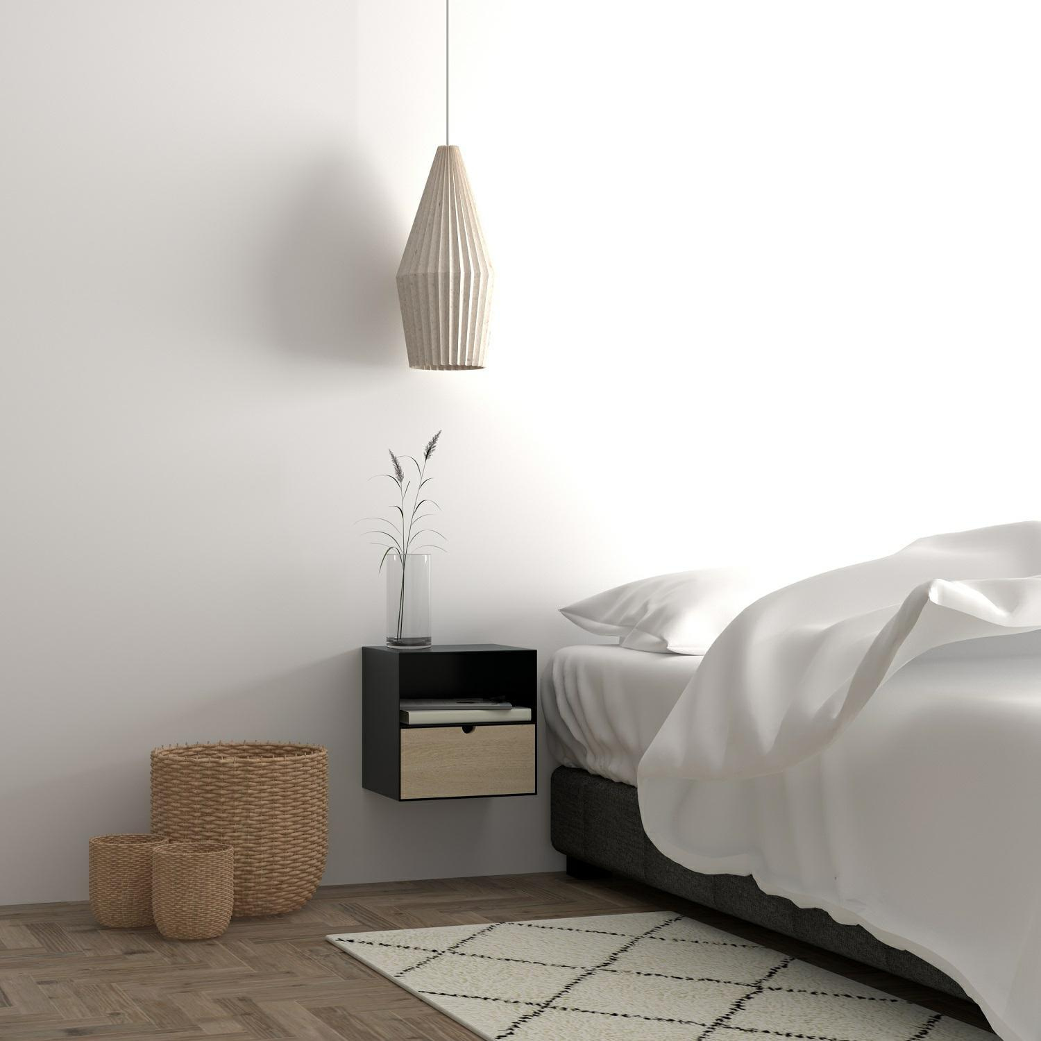Szafka nocna Joliet to minimalistyczny, nowoczesny mebel dla miłośników dobrego stylu. Korpus wykonany jest z malowanego proszkowo metalu, zaś szuflada z wytrzymałego bambusa. Szafka zapewnia możliwość personalizacji – szufladę można umieścić na górze lub na dole. W połowie wysokości szafki znajduje się metalowa półka. Wymiary: 30x25x30 cm Waga: 5,2kg