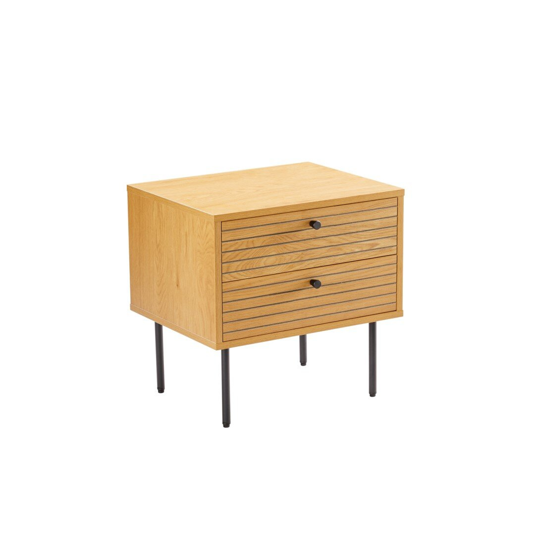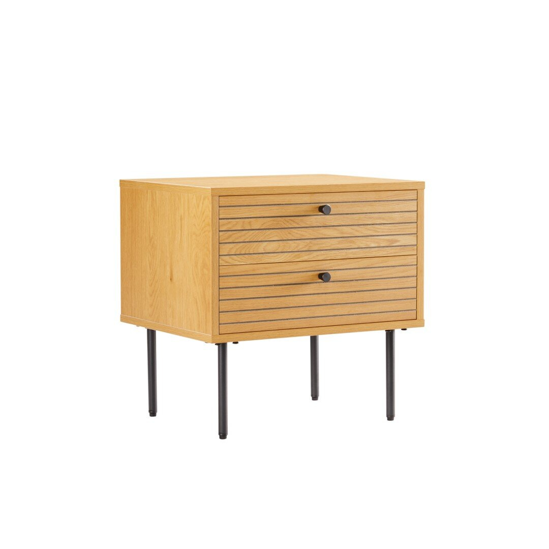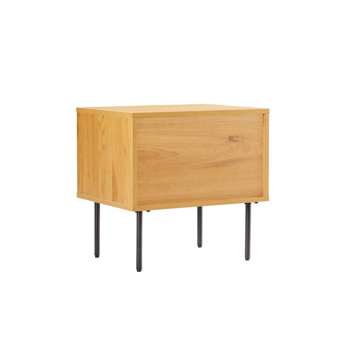 Korpus szafki jak i fornty wykonane zostały z wytrzymałej płyty MDF, która ozdobiona została okleiną imitującą fornir dębowy. Fronty szuflad o ciekawym wyflowanym poziomo wzorze wyglądają jak lamele. Każda z szuflad wyposażona została w czarny, metalowy uchwyt. Minimalistyczne uchwyty ciekawie korespondują z czarną metalową podstawą komody. Czarne nogi pomalowane zostały proszkowo dzięki czemu są odporne na uderzenia, np podczas odkurzania. Nogi komody zakończone zostały stopkami z tworzywa, aby zapobiec rysowaniu się podłogi pod meblem.