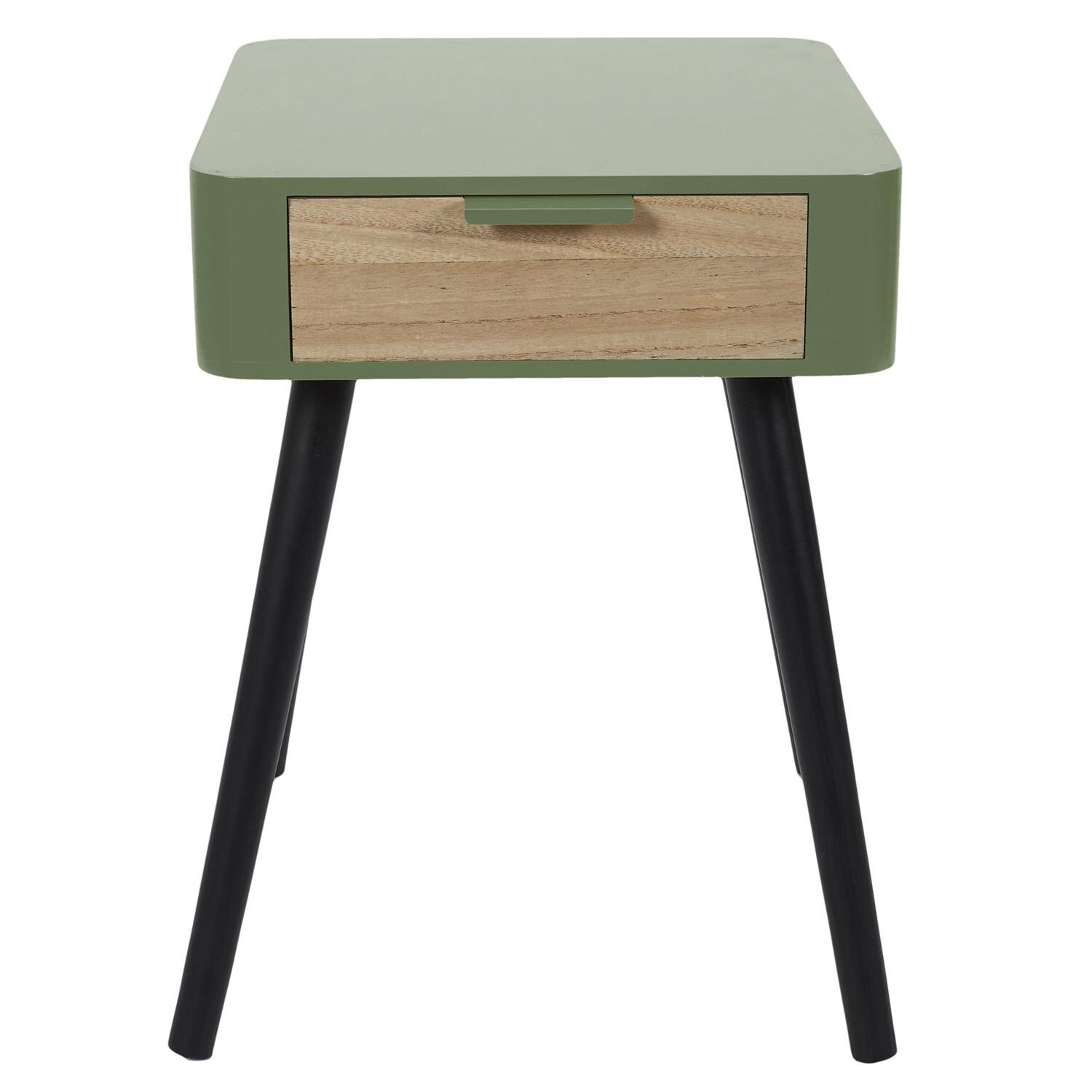 Drewniana szafka nocna Padano to mebel idealny do sypialni w stylu skandynawskim. Szafka nocna na czterech nogach z litego drewna sosnowego pomalowana została na ciekawy oliwkowy kolor. Korpus szafki został wyprodukowany z mocnej płyty MDF. Szafka posiada pojemną szufladę, której front pokryty został laminatem imitującym drewno.
