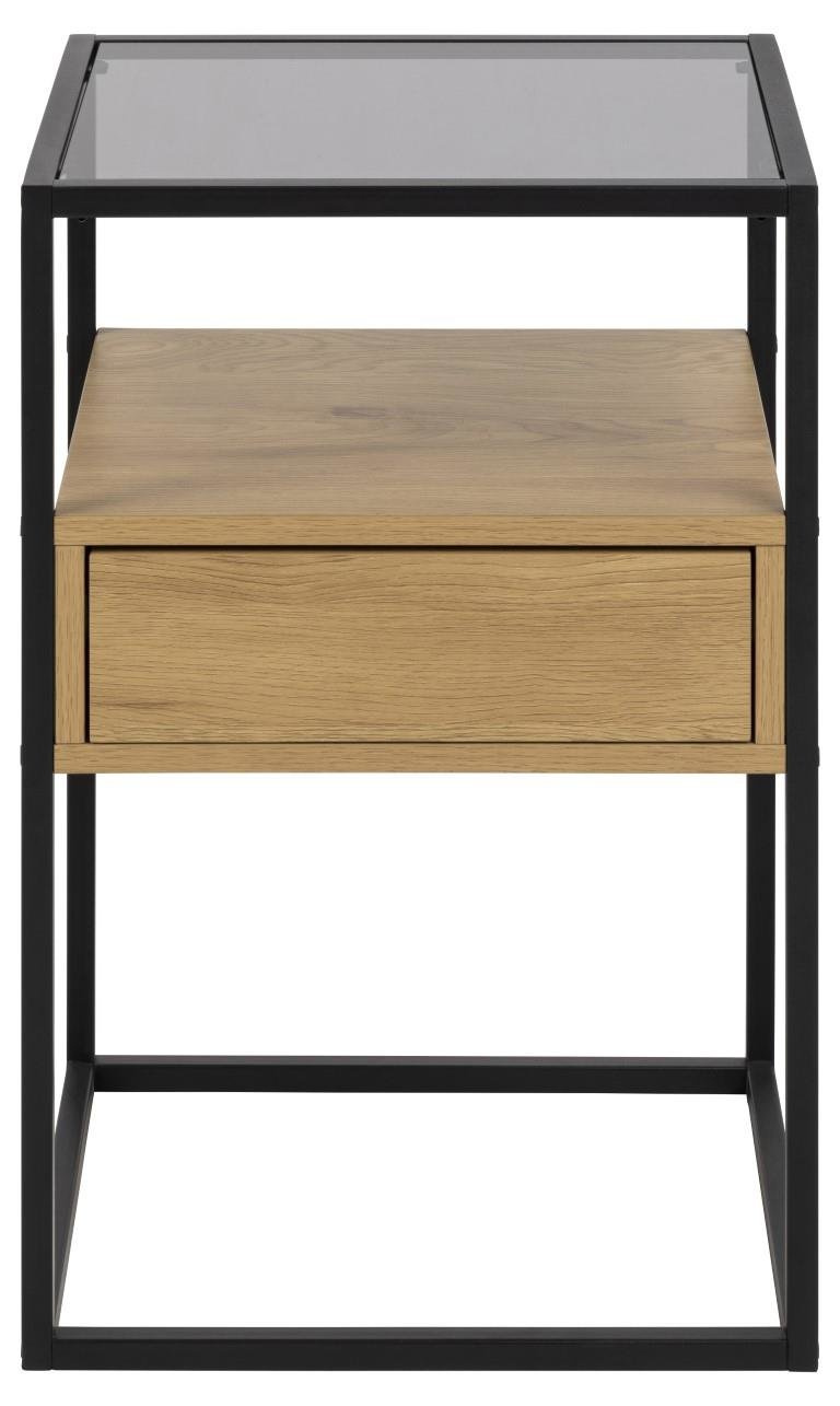 Szafka nocna Randolf to stylowe połączenie elementów szklanych, metalowych i drewnianych. Jej szkielet wykonany jest z malowanego proszkowo metalu w kolorze czarnym. Kwadratowy blat to dymione szkło hartowane, zaś znajdująca się pod nim szuflada to w całości płyta MDF w okleinie w kolorze dębu. Szafka Randolf utrzymana jest duchu stylu industrialnego, spodoba się osobom ceniącym minimalistyczny wystrój. Ilość kartonów: 1 Wymiary kartonów: 68,5x40x9cm Waga kartonów: 9,7kg
