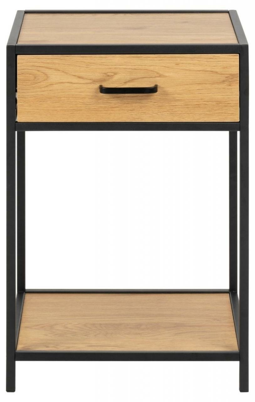 Szafka nocna Seaford to industrialny mebel wykonany z metalu oraz płyty MDF wykończonej laminatem w kolorze dzikiego dębu. Podstawa jak i baza posiadają matowe wykończenie. Całość mebla utrzymana jest w naturalnej kolorystyce połączonej z kontrastową czernią. Maksymalne obciążenie szafki wynosi 30kg, wymaga ona montażu, waży 8kg.
