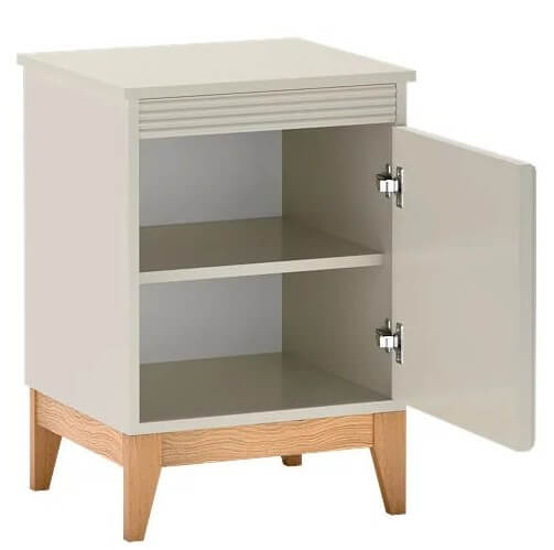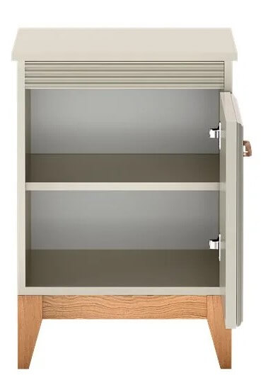 Mebel wyposażono w zamykaną szafkę z wewnętrzną półką – to praktyczne rozwiązanie, które umożliwia uporządkowane przechowywanie najpotrzebniejszych drobiazgów, takich jak ładowarki, książki czy kosmetyki. Blat szafki zapewnia wygodną przestrzeń na lampkę nocną, budzik lub filiżankę herbaty. Całość wsparta jest na solidnych, dębowych nogach, które podkreślają naturalne wykończenie i zapewniają stabilność.