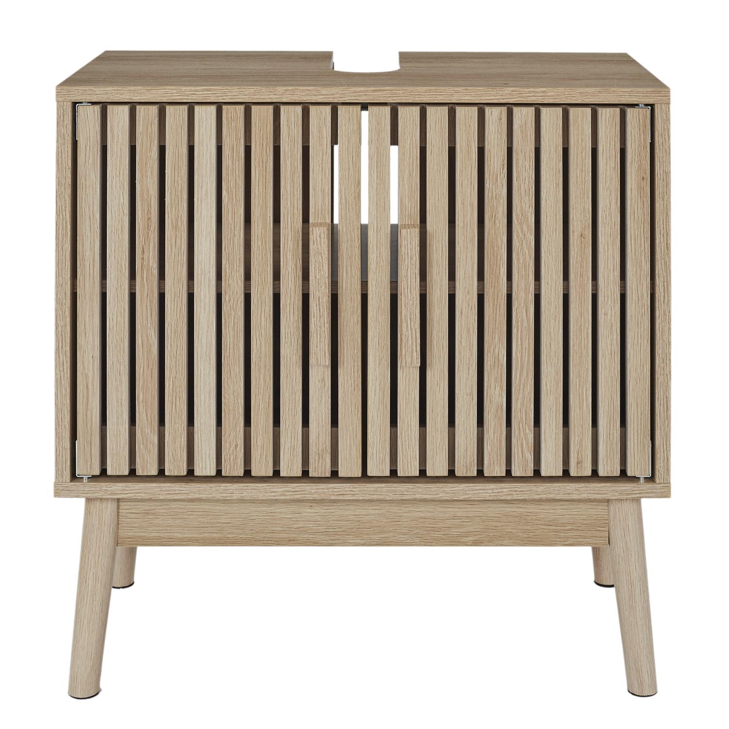 Szafka pod umywalkę Klaus to nowoczesny mebel łazienkowy o eleganckim i minimalistycznym designie. Fronty szafki są zdobione pionowymi, wąskimi listwami, które tworzą ciekawy efekt wizualny i dodają tekstury. Uchwyty są zintegrowane z frontami, co podkreśla nowoczesny charakter mebla. Szafka stoi na czterech krótkich nogach, które są lekko rozstawione na zewnątrz, co zapewnia jej stabilność. Długość produktu (CM): 60 Wysokość produktu (CM): 70 Głębokość produktu (CM): 30 Waga produktu (GR): 13300 Materiał: drewno sosna, MDF, papier