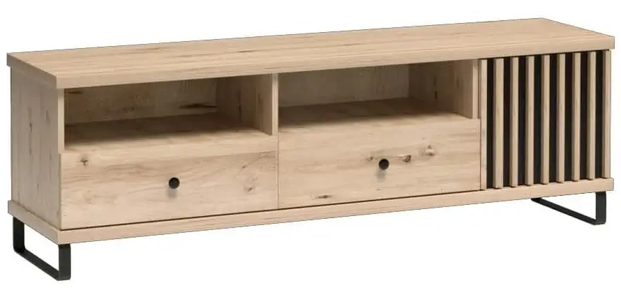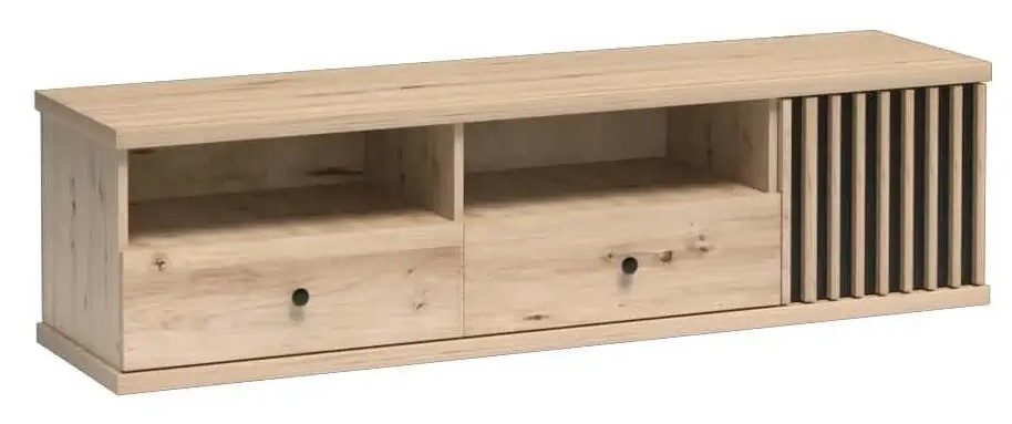 Prosta szafka RTV w nowoczesnym wydaniu z czarnym frontem z lamelami. Korpus mebla to laminowana płyta w kolorze Artisan. Pomieści wiele rzeczy które potrzebne są w salonie przy telewizorze. Szafka ma dwie wysuwane szuflady z cichym domykiem.
