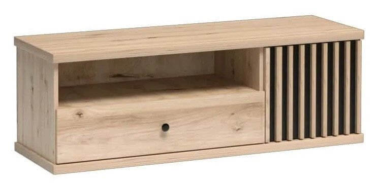 Nowatorska szafka z jedną szufladą w centralnej części i jedną szafką. Naturalny kolor ARTISAN w połączeniu z czarnym frontem i lamelami. Szafka jest średniej wielkości, zmieści się w każdym salonie. Zastosowane w niej zawiasy i prowadnice z cichym domykiem nie spowodują, ze musisz martwić się czy kogoś nie obudzisz.
