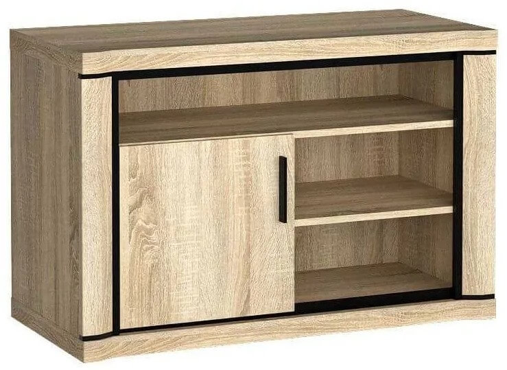 Piękna szafka RTV w kształcie prostopadłościanu, świetnie wpasowuje się w trendy. Swoim nadzwyczajnym wyglądem i wysoką funkcjonalnością, będzie idealnie prezentował się wśród bliskich oraz wprowadzi miłą atmosferę. Mebel wyposażony jest w trzy półki, dwie mniejsze i jedną większą, z czego jedna z nich przykryta jest szafką. Doskonałe miejsce na wszelkie drobiazgi, akcesoria czy przydatne przedmioty. Nie zapomnijmy o blacie, na którym świetnie się będą prezentować ozdoby oraz pamiątki. Metalowe uchwyty oraz obramowania na frontach tworzą z niej zapierającą dech w piersiach aranżację. Dostępna w dwóch wybarwieniach.