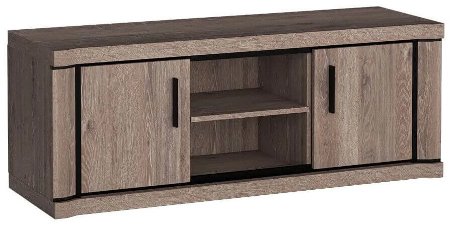 Nie od dziś wiadomo, że salon to najważniejszy pokój w domu, a szafka RTV to niezbędny mebel w tym pomieszczeniu. W jej skład wchodzą trzy półki, z czego dwie po bokach przykryte są szafkami. Mebel cechuje się wytrzymałą i solidną konstrukcją z mocnych materiałów, udekorowany pięknymi oblamówkami na frontach oraz metalowymi uchwytami.