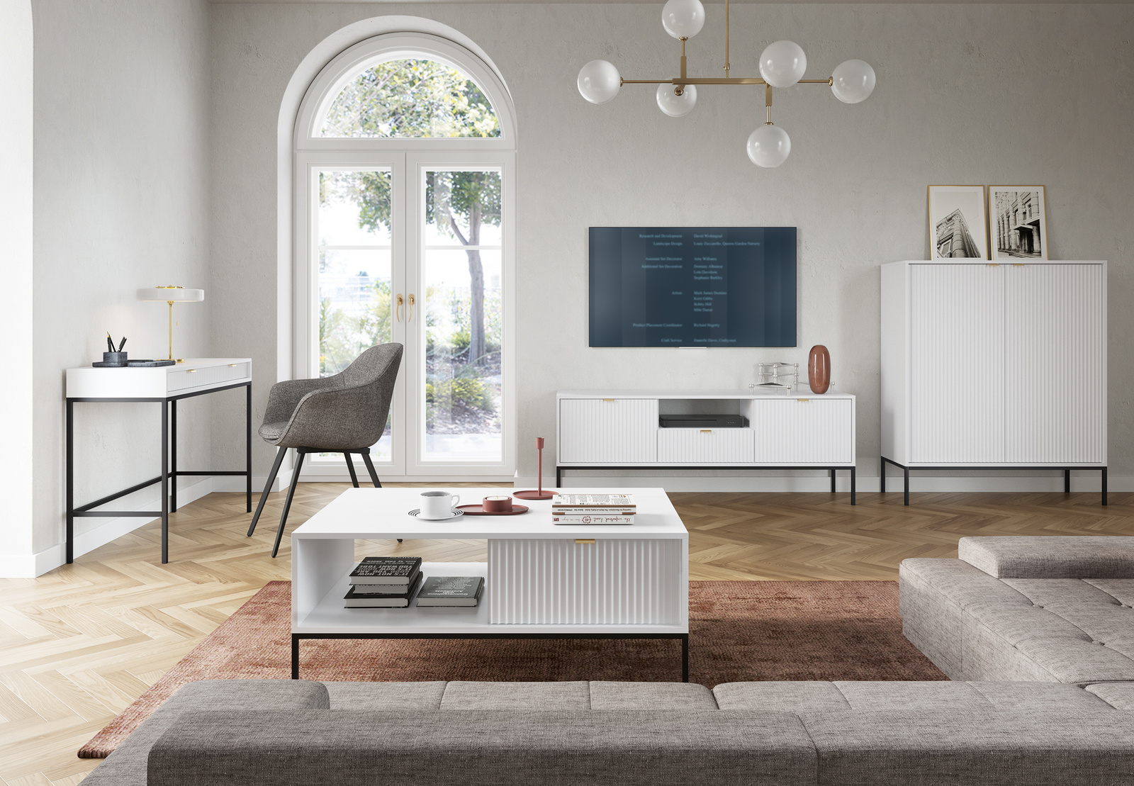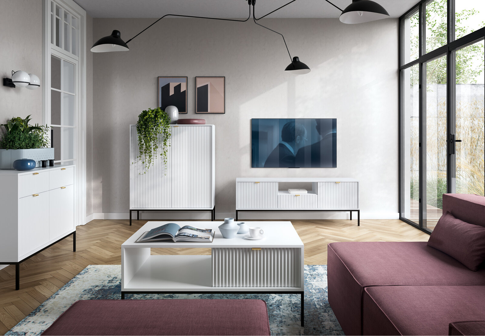 Szafka RTV na czarnych metalowych nogach to połączenie nowoczesnego stylu z elegancją. Fronty szafki ozdobione lamelami nadają jej charakteru, a złote uchwyty dodają subtelności. Idealna propozycja dla tych, którzy szukają funkcjonalnego i stylowego mebla do swojego wnętrza.