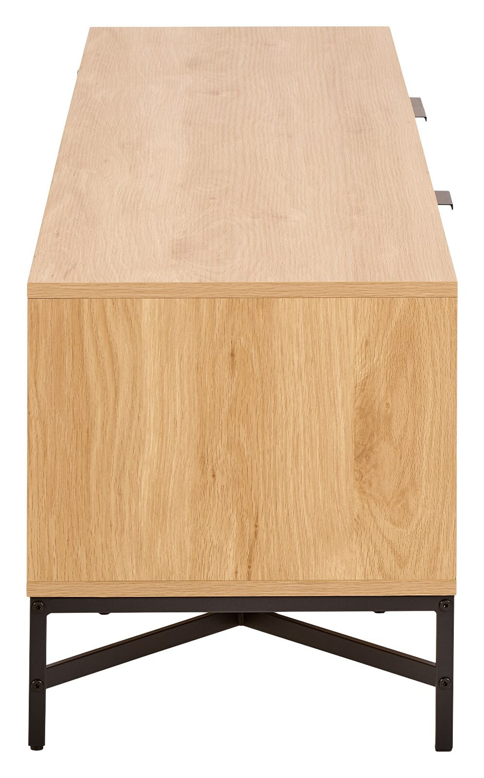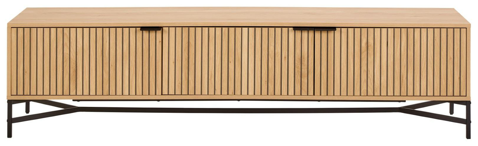 Dzięki swojemu minimalistycznemu wyglądowi ta szafka pod telewizor jest czymś więcej niż tylko miejscem do przechowywania multimediów. Dębowy wygląd i listwowy front w połączeniu z czarnymi stalowymi elementami wprowadzają nowoczesny kontrast do każdego domu. Wyposażona w łatwą do czyszczenia powierzchnię, szafka TV ma 3 drzwi, otwartą przegrodę i półkę do wygodnego przechowywania.