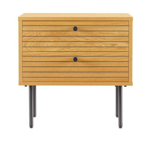 Minimalistyczna szafka RTV to połączenie metalowej bazy z dwoma półkami wykonanymi z płyty MDF ozdobionej okleina imitującą drewno. Szafka RTV Loka sprawdzi się we wnętrzu loftowym lub rustykalnym.