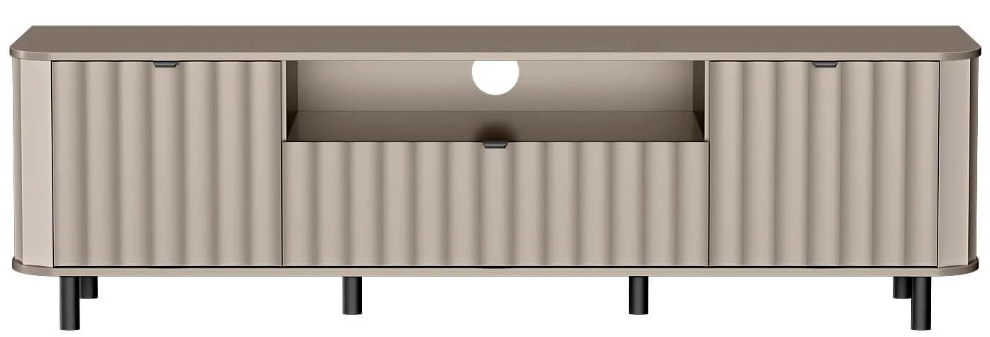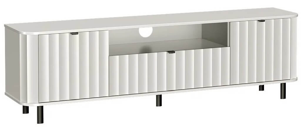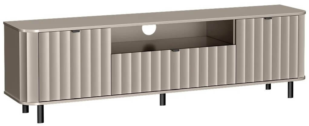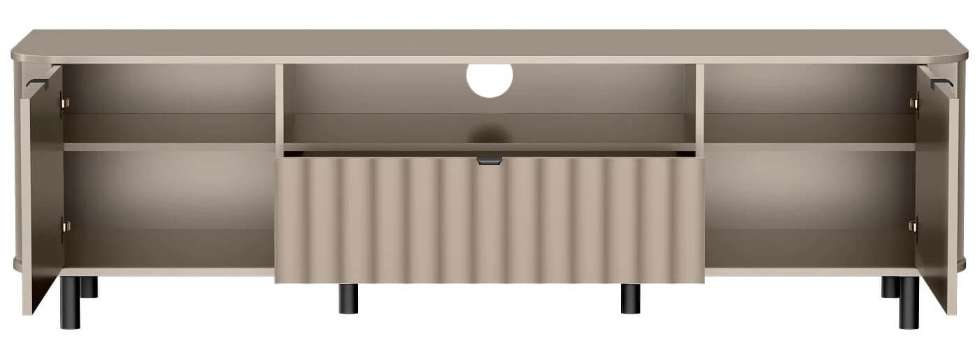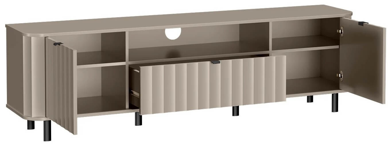 Nowoczesna szafka RTV z tej serii została zaprojektowana z myślą o codziennym komforcie użytkowania – szeroki blat pomieści duży ekran, a poniżej znajdziemy przemyślane miejsce do przechowywania: wnęki na dekodery, konsolę czy soundbar, oraz zamykane szafki na drobiazgi, które chcemy mieć pod ręką, ale nie na widoku.