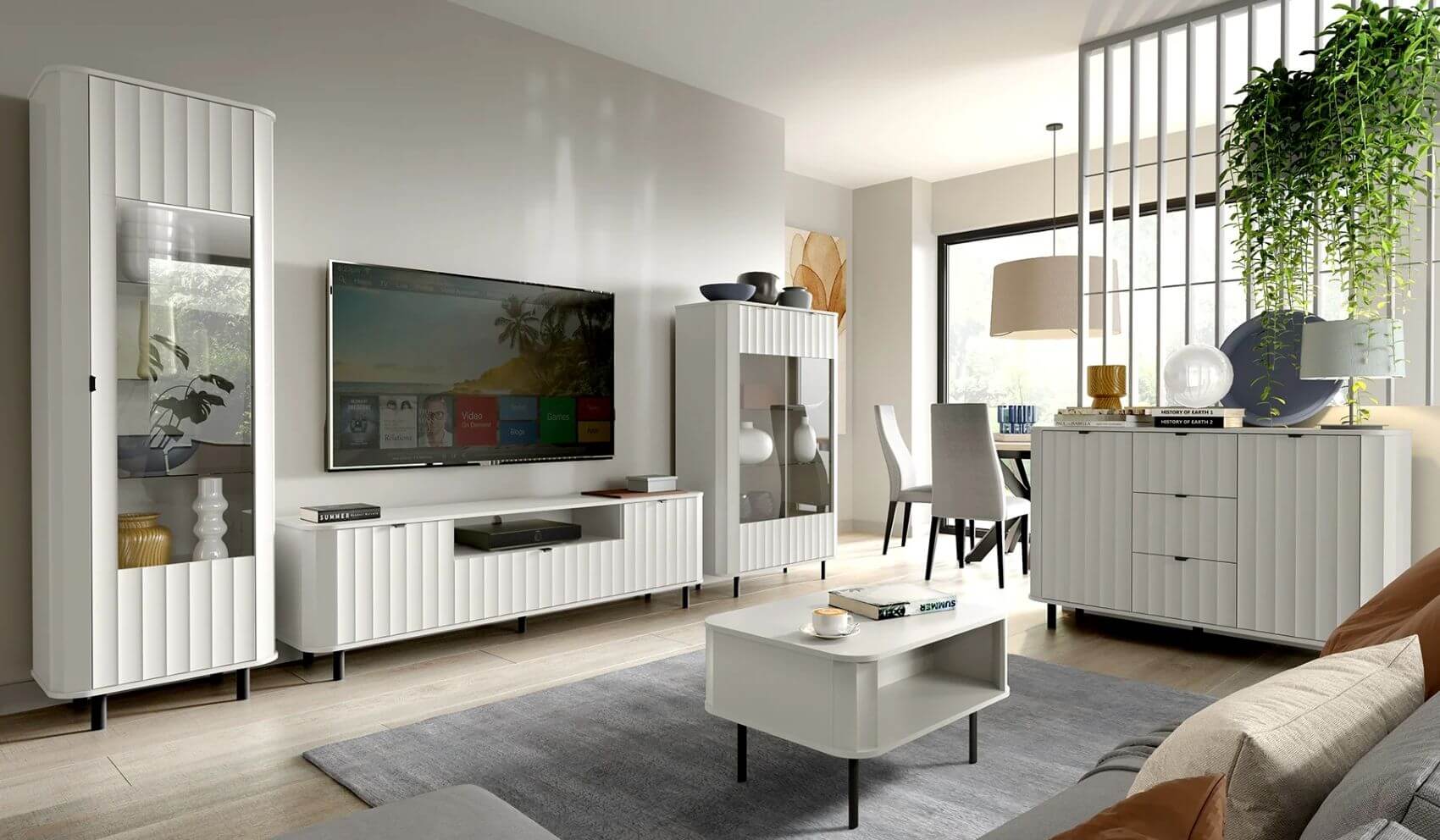 Szafka RTV NOVADO – 6 dostępna jest w dwóch modnych kolorach: stonowanym clay gray oraz ponadczasowej bieli – obie wersje pięknie wpisują się w nowoczesne wnętrza inspirowane stylem lifestyle’owym, skandynawskim i minimalistycznym.