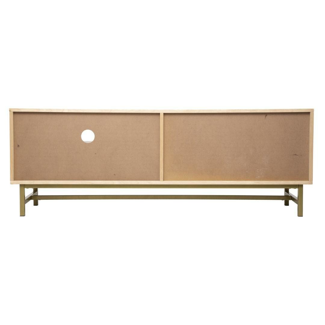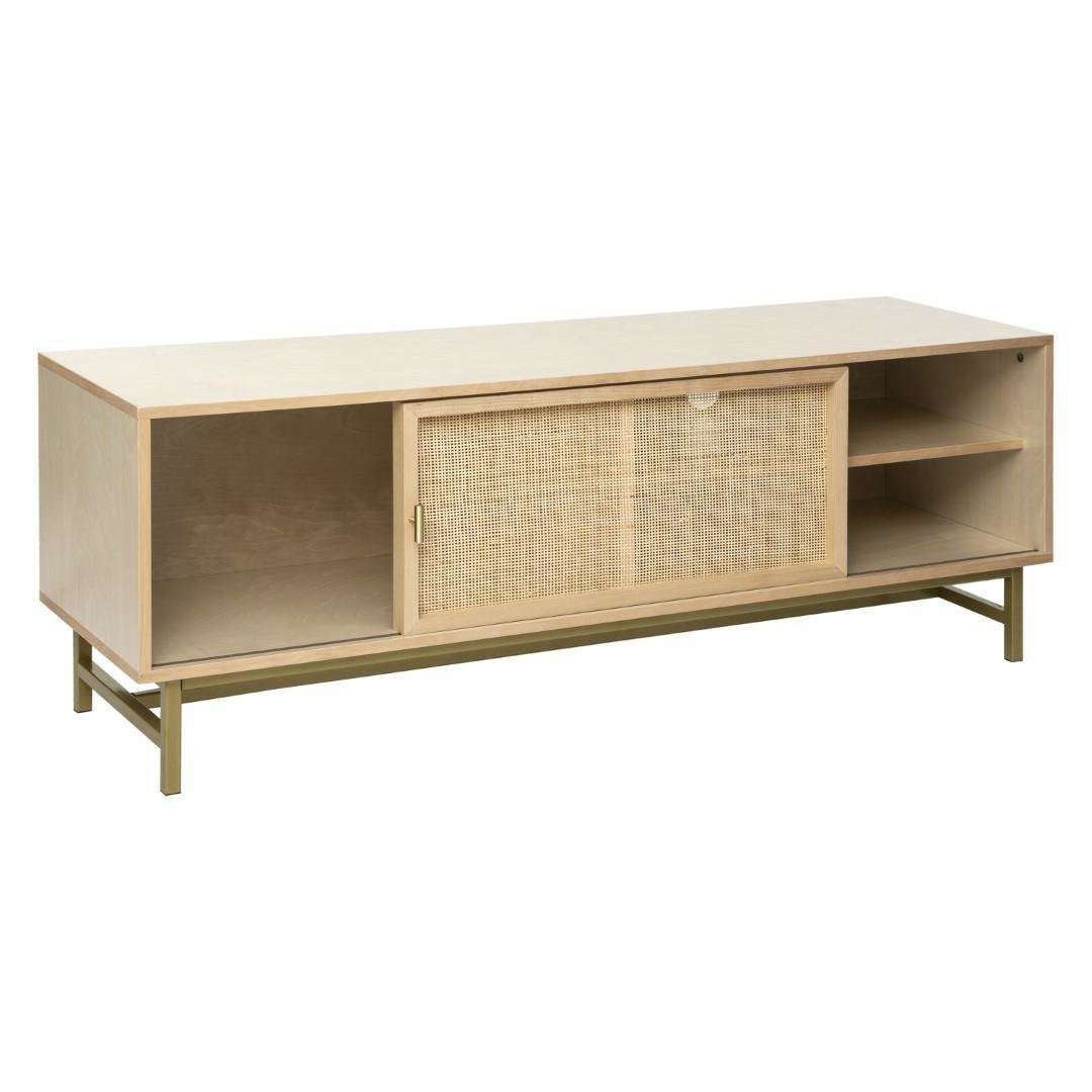 Szafka RTV z rattanowymi, rozsuwanymi frontami to mebel nawiązujący do natury oraz naturalnych materiałów. Plecionka z rattanu umieszczona została w drewnianych- brzozowych frontach szafki, dodając meblowi wizualnej lekkości.Nogi komody oraz uchwyty zostały wykonane z metalu, pomalowanego na złoty kolor.