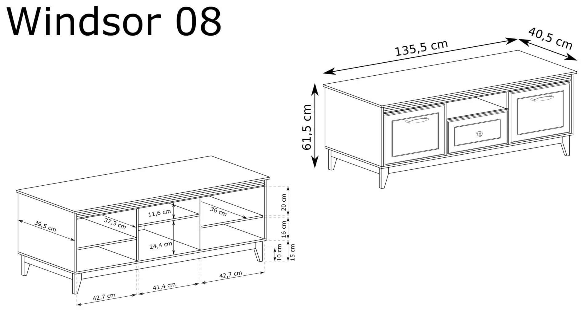 Przemyślany układ przechowywania zapewnia wygodę i porządek. Dwie zamykane szafki pomieszczą wszystkie niezbędne akcesoria, a otwarta wnęka pozwala na wygodne przechowywanie sprzętu multimedialnego. Dodatkowa szuflada umożliwia uporządkowanie drobiazgów, a system cichego domyku gwarantuje komfortowe użytkowanie bez zbędnego hałasu. Szafka RTV WINDSOR – 8 to połączenie funkcjonalności i estetyki, które wprowadzi do Twojego salonu elegancję i porządek. Doskonale sprawdzi się jako centrum rozrywki, zapewniając wygodę i praktyczne rozwiązania na co dzień.