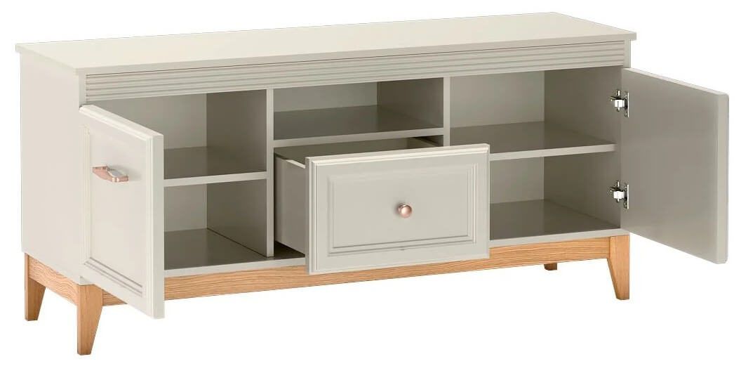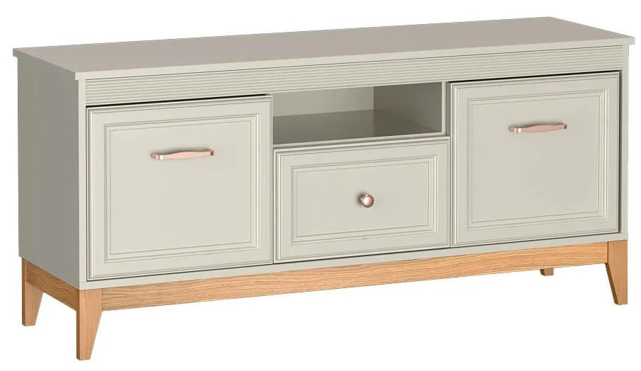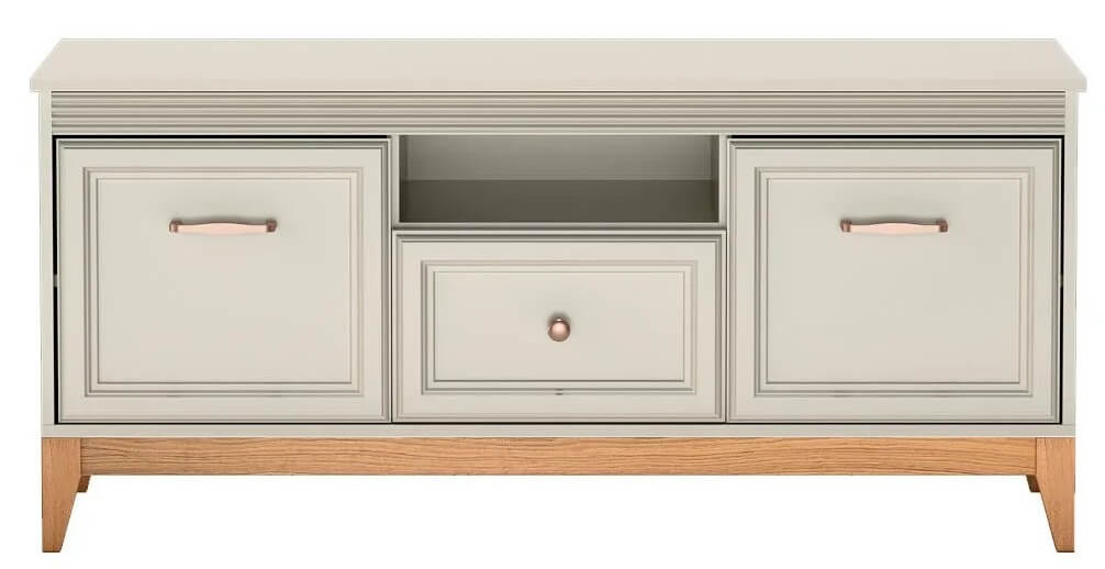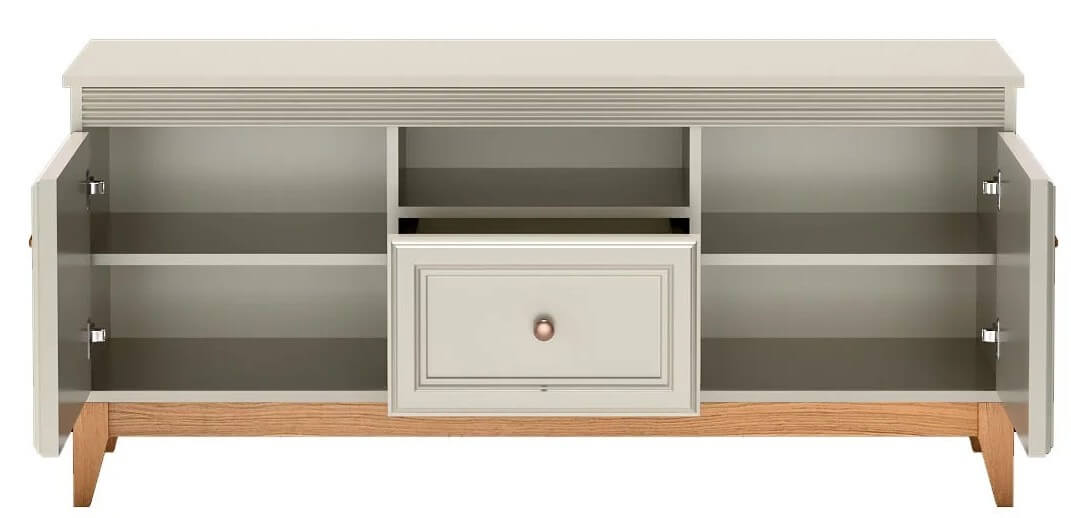WINDSOR – 8 to stylowa i funkcjonalna szafka RTV, która łączy elegancję z nowoczesnymi rozwiązaniami. Jej subtelna kolorystyka w odcieniu kaszmiru, zestawiona z drewnianymi elementami, wprowadza do wnętrza ciepło i harmonię. Klasyczne detale i precyzyjne wykończenie sprawiają, że szafka doskonale komponuje się zarówno w tradycyjnych, jak i nowoczesnych aranżacjach salonu.