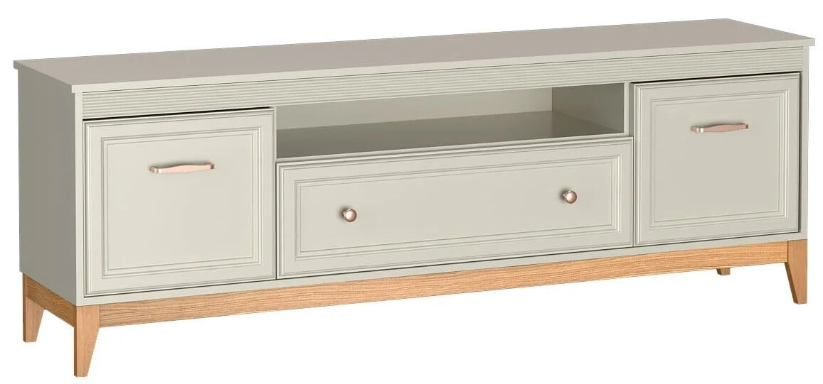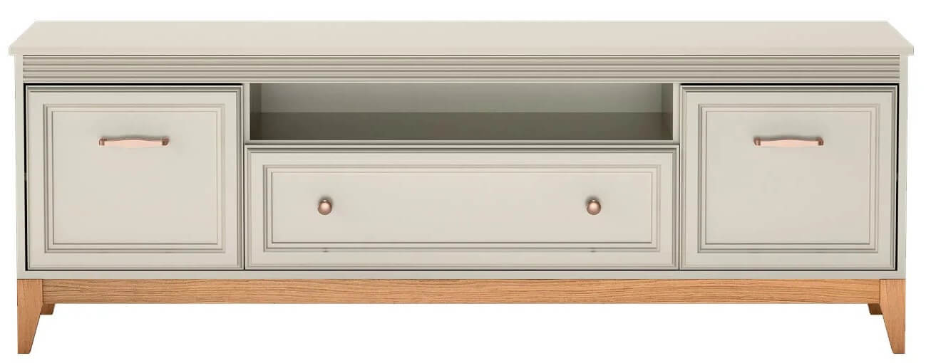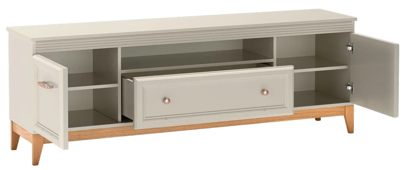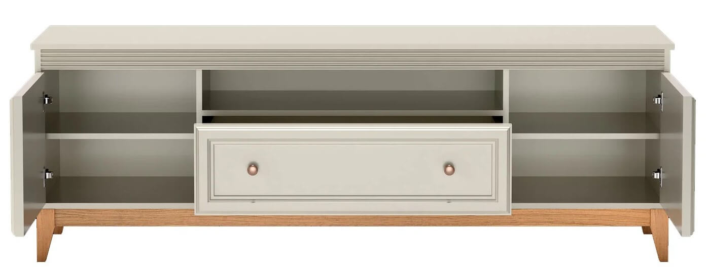 Dodaj elegancję i funkcjonalność do swojego salonu dzięki szafce RTV WINDSOR – 9. To większa wersja modelu WINDSOR – 8, idealna dla osób szukających stylowego i pojemnego mebla pod telewizor. Klasyczny design w kolorze kaszmiru, uzupełniony o drewniane nóżki i subtelne uchwyty, sprawia, że szafka doskonale komponuje się z wnętrzami w stylu nowoczesnym, skandynawskim i klasycznym.