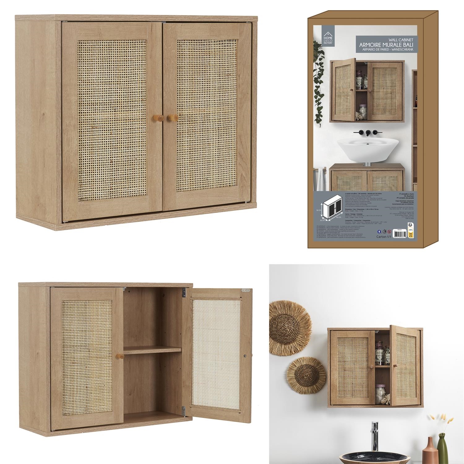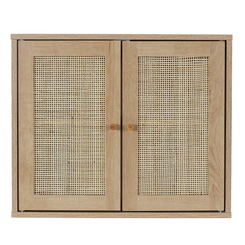 Szafka wisząca Bali to idealny mebel nad pralke lub nad umywalkę. Dzięki szafce zyskamy więcej miejsca do przechowywania kosmetyków lub detergentów. Szafka do samodzielnego montażu. Szafka wykonana z płyty MDF w okleinie imitującej dąb. Fronty dodatkowo ozdobione rattanowymi wstawkami.