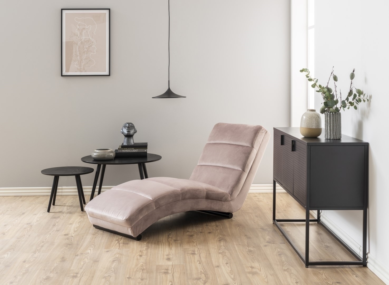 Szezlong Slinky to leżanka do nowoczesnych wnętrz. Delikatnie wyprofilowany szezlong będzie idealnym miejscem do poczytania książki. Tkanina jaka została użyta to VIC fabric dusty rose 18. Szezlong został umieszczony na dwóch nóżkach. Nogi zostały zrobione z dwóch metalowych rurek pomalowanych na czarno. Waga: 21 kg. Wymiary kartonu: 85cm x 64cm x 178cm Wysokość siedziska: 37 cm Szerokość siedziska: 60 cm Głębokość siedziska: 119 cm