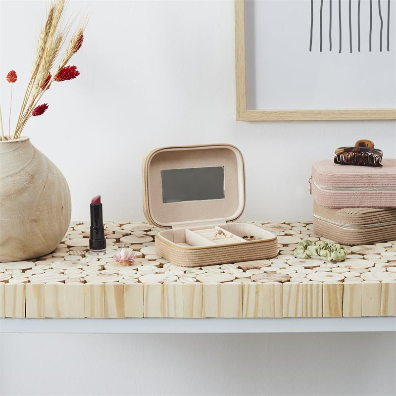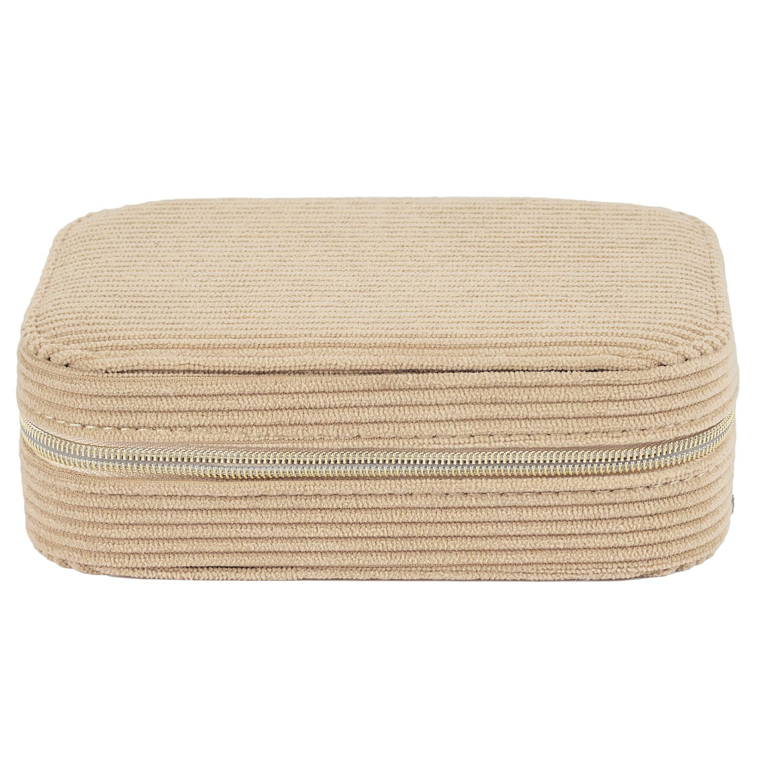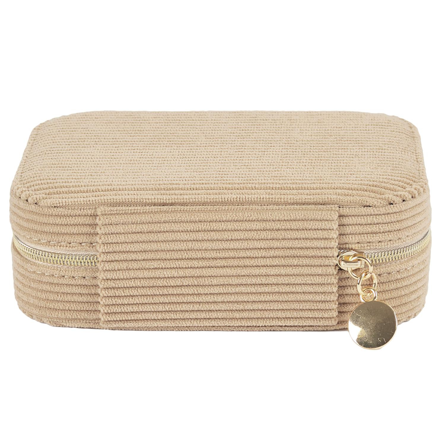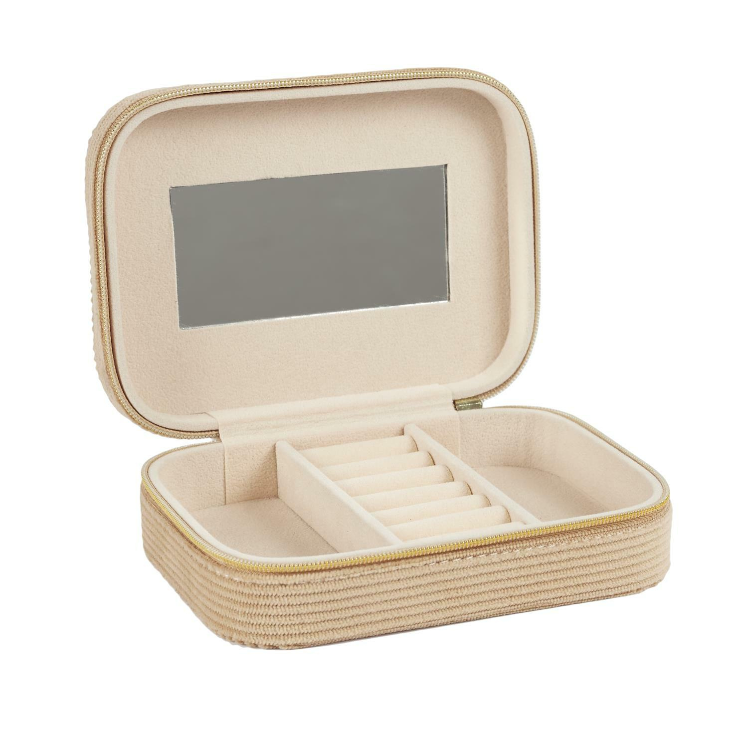 Sztruksowa szkatułka zasuwana na suwak to idealny organizer na biżuterię. Szkatułka wyposażona jest w przegródki na pierścionki, bransoletki raz kolczyki. Szkatułka po wewnętrznej stronie pokrywy ma zamontowane małe lusterko. Dostępna w 3 kolorach.