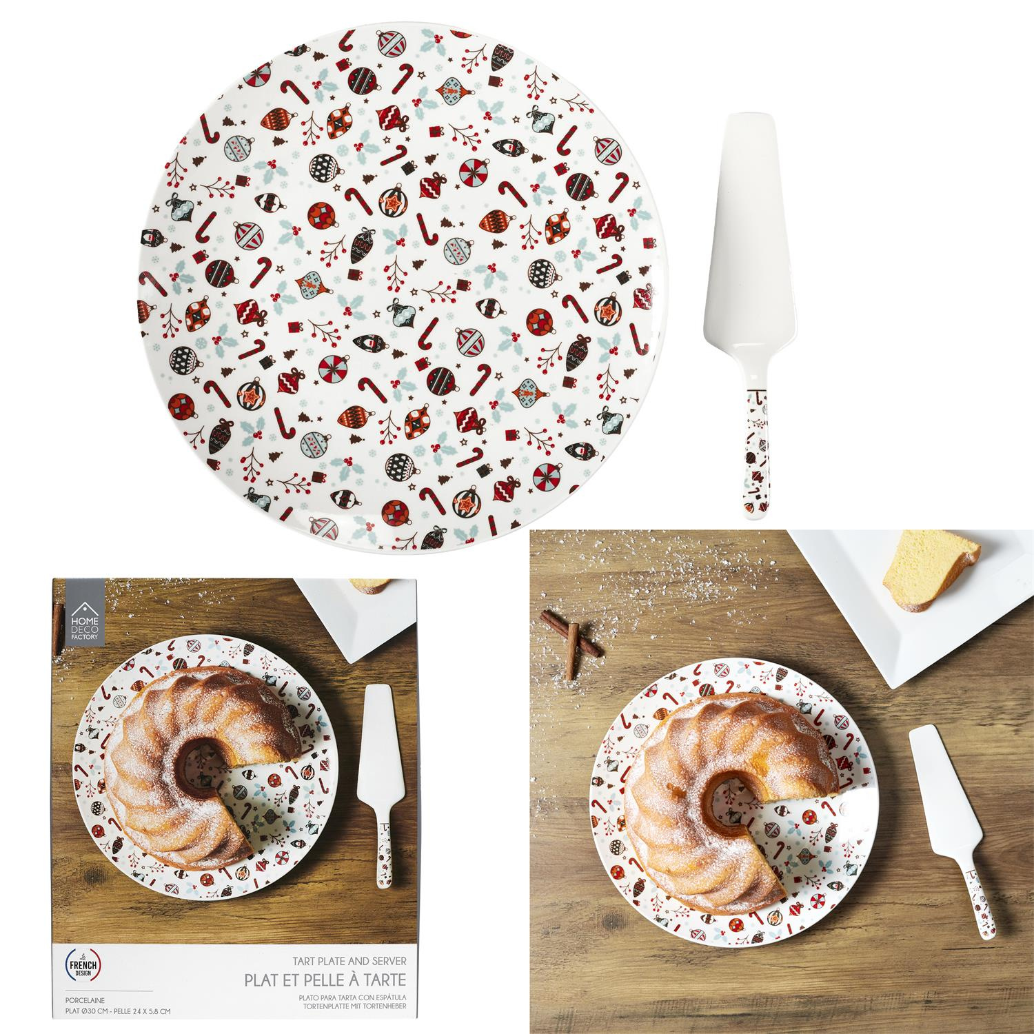 Talerz na ciasto w świąteczny wzór to idealny element nie tylko dekoracji ale również serwowania świątecznej babki lub ciasta marchewkoweg. Drobny wzorek występuje zarówno na talerzu jak i na łopatce dołączonej do zestawu. Całośc wykonana z ceramiki szklwionej. Można używać w mikrofalówce, zmywarce.