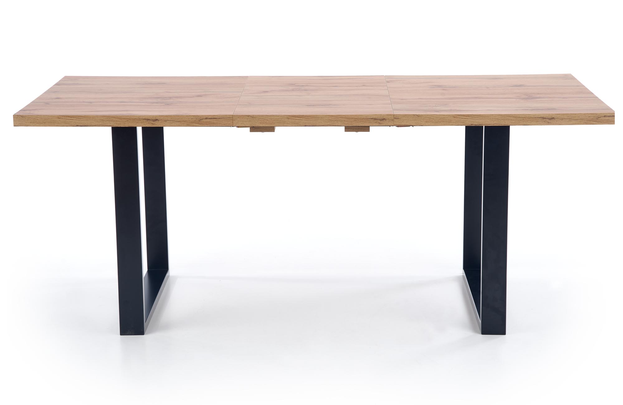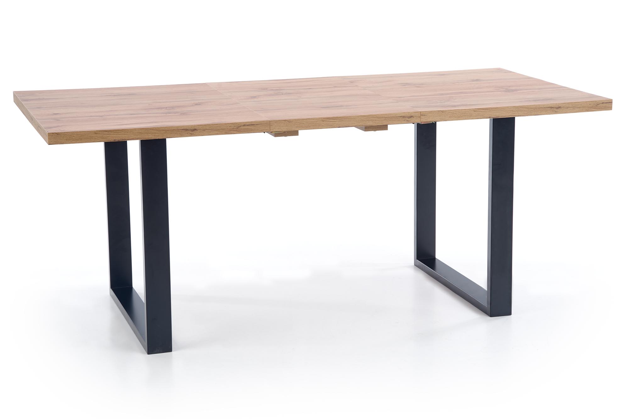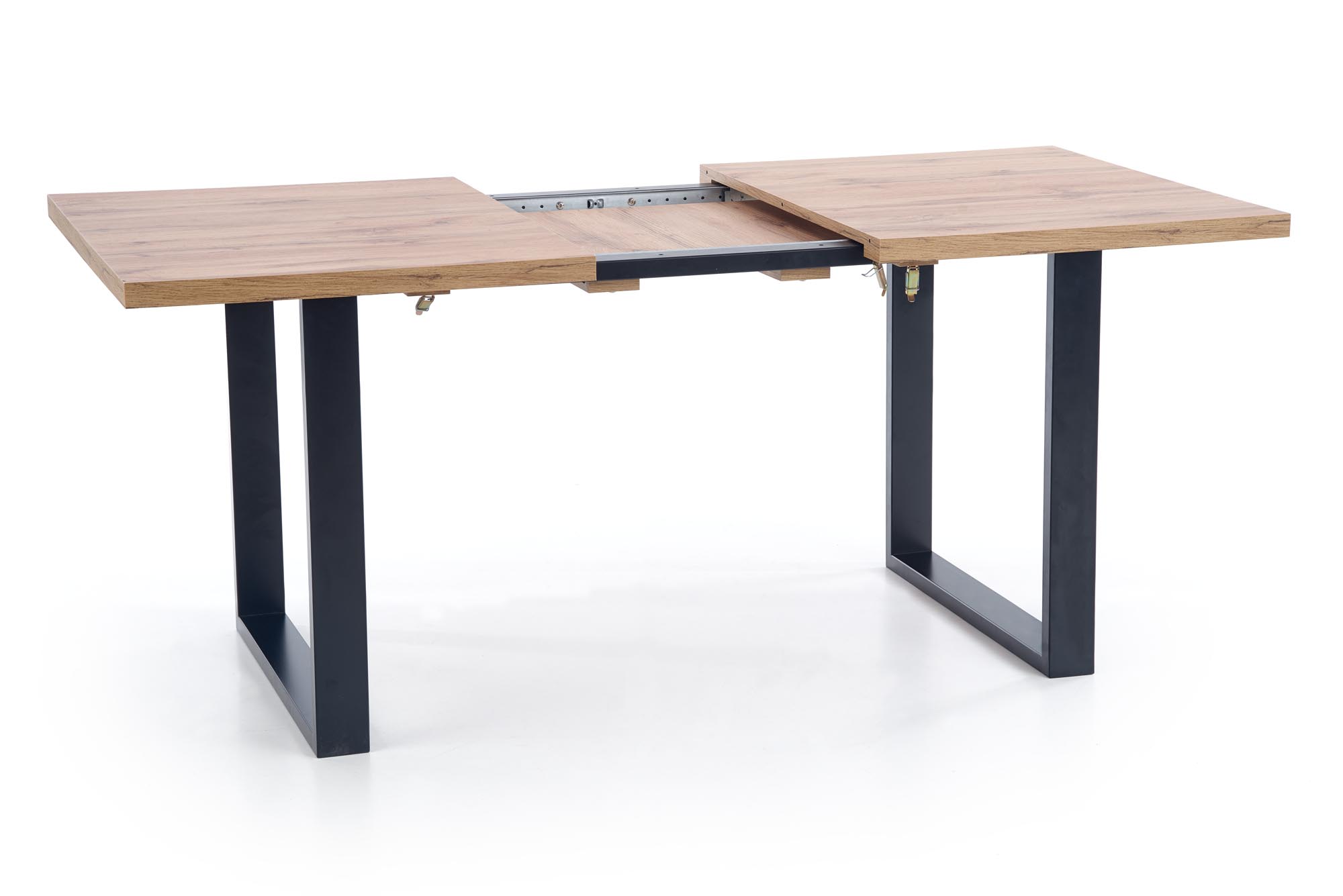 stół rozkładany, wymiary: 160÷210/90/74 cm, materiał: blat – płyta meblowa laminowana, na obrzeżach ABS, nogi – stal malowana proszkowo, kolor: blat – dąb wotan, nogi – czarne