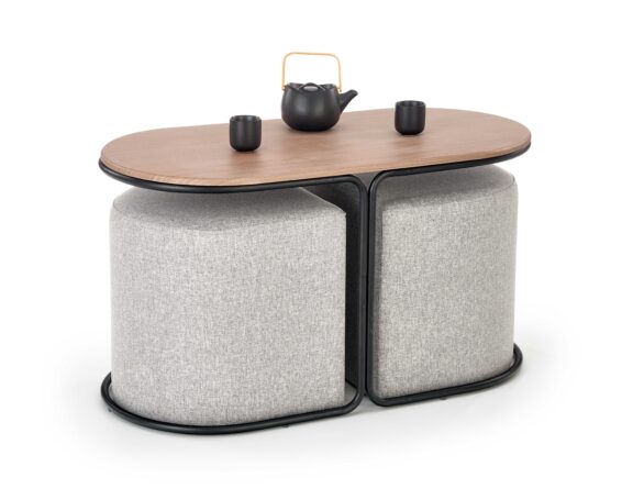 PAMPA, ława z pufami, blat: orzech, nogi: czarny, pufa: popielaty